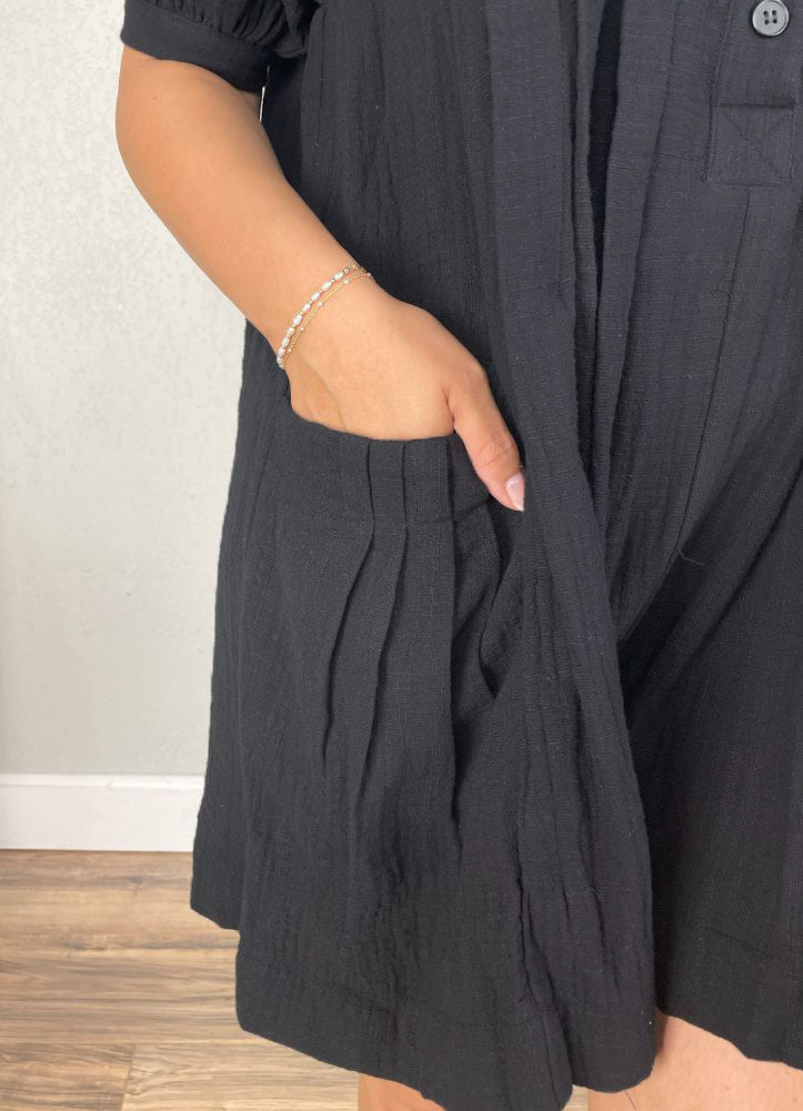 Effortlessly cool and endlessly versatile, this black button-front romper features cuffed sleeves, a relaxed fit, and convenient side pockets—your go-to for comfy-chic style all season long.