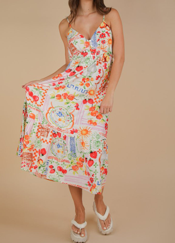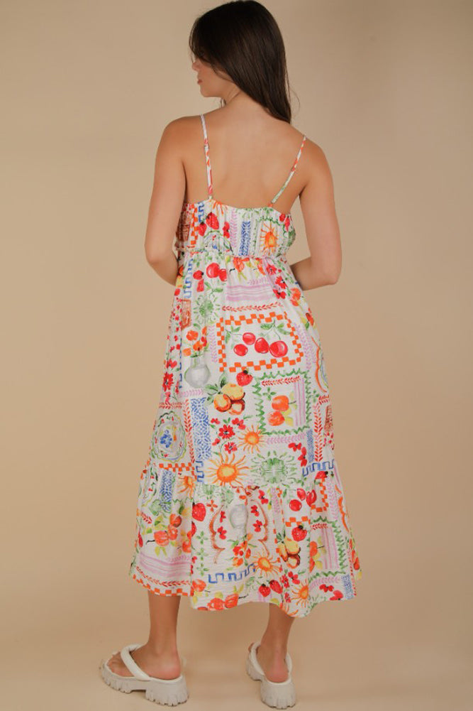 Bursting with cheerful charm, this strappy sundress features a vibrant patchwork of sunflowers, strawberries, cherries, and vintage-style prints. With a flattering sweetheart neckline and breezy silhouette, it's the perfect pick for sunny days, farmers' markets, or whimsical summer getaways.