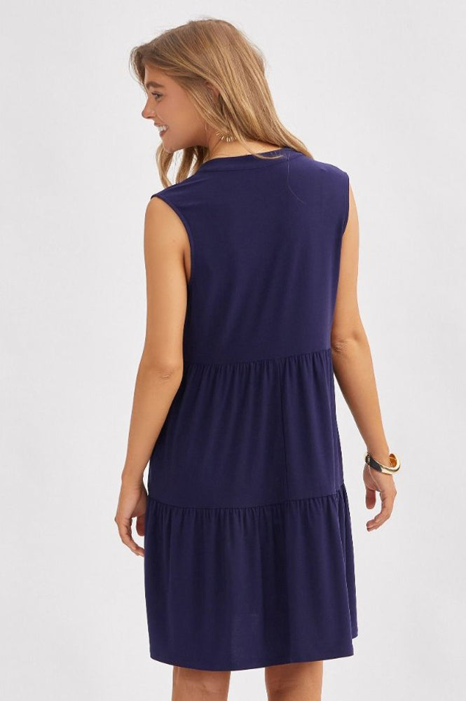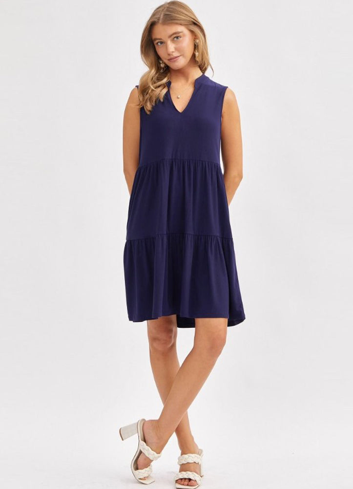 Brighten up your wardrobe with this sleeveless navy tiered dress. Featuring a flattering V-neckline and flowy silhouette, it's the perfect pick for sunny days and casual-chic occasions.