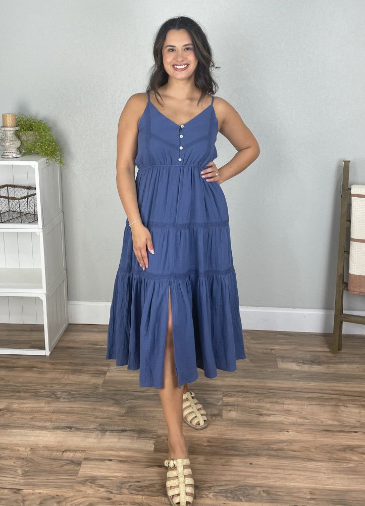 Breezy and beautiful, this tiered blue sundress features adjustable spaghetti straps, front button detail, and a subtle front slit—your go-to for sunny days, beach strolls, and effortless summer style.