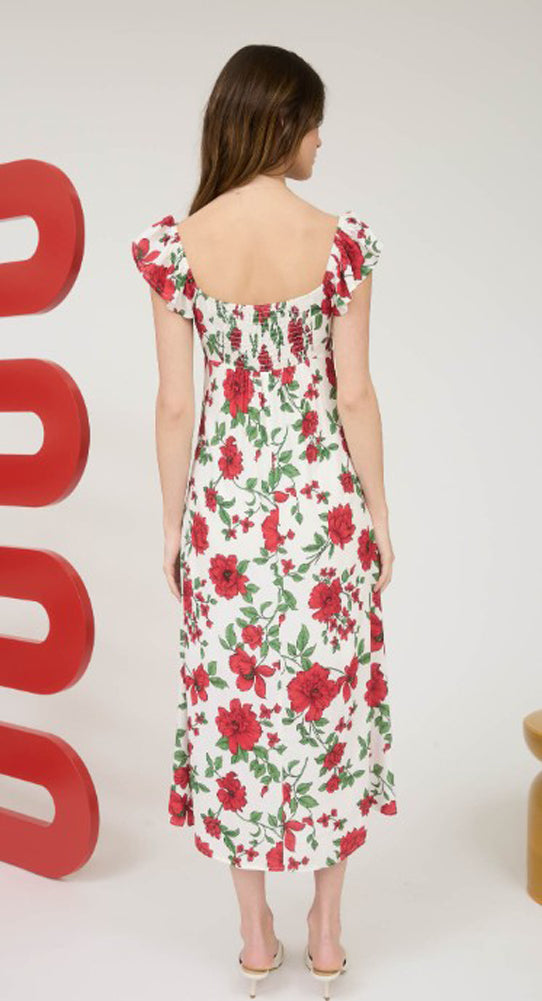 This cream midi dress bursts with vibrant red florals, fluttery ruffle sleeves, and a charming tie-front neckline — a fresh, feminine favorite for sunny strolls.