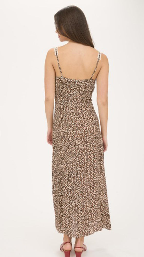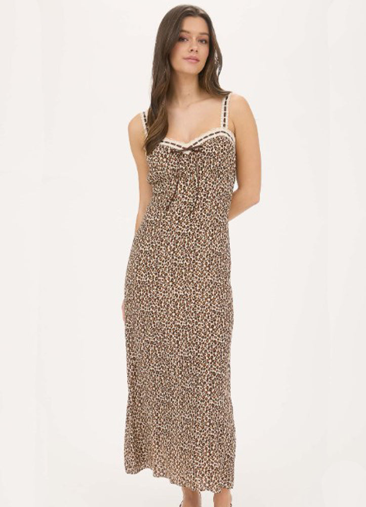 This leopard print midi dress features delicate lace trim, dainty bow detailing, and adjustable straps — the perfect blend of wild charm and romantic flair for day-to-night style.