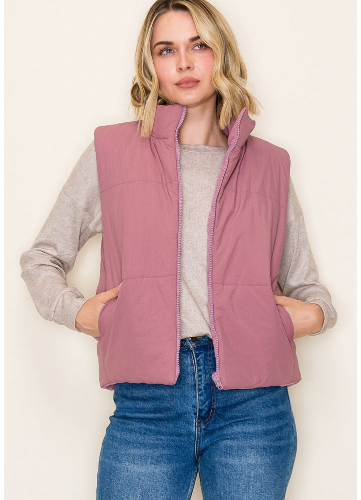 Layer up in style with this rose colored zip-front vest, designed with a sleek silhouette and practical front pockets. Lightweight yet warm, it's the perfect versatile piece to pair over sweaters and long sleeves for a cozy, casual look.