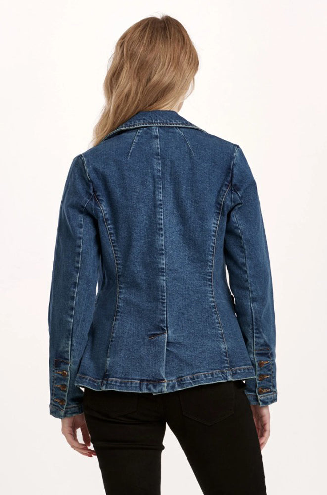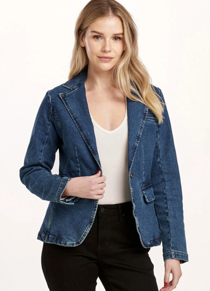 Redefine smart casual with this tailored denim blazer—featuring structured seams, flap pockets, and subtle distressed accents for a blend of sophistication and laid-back edge. Perfect for dressing up your everyday denim look.