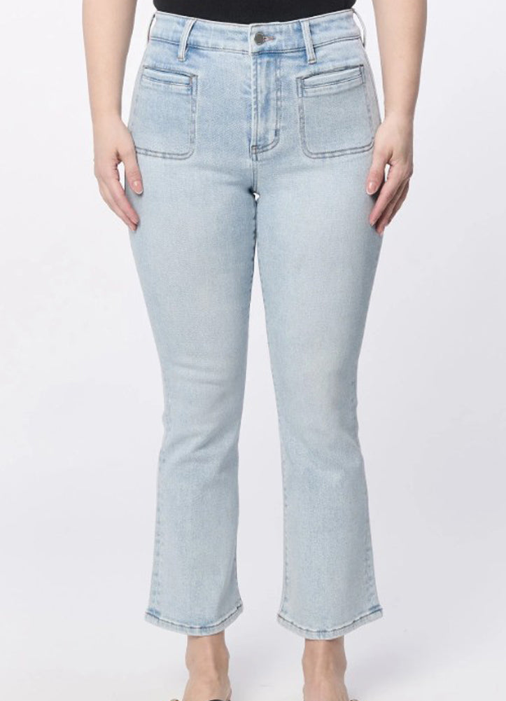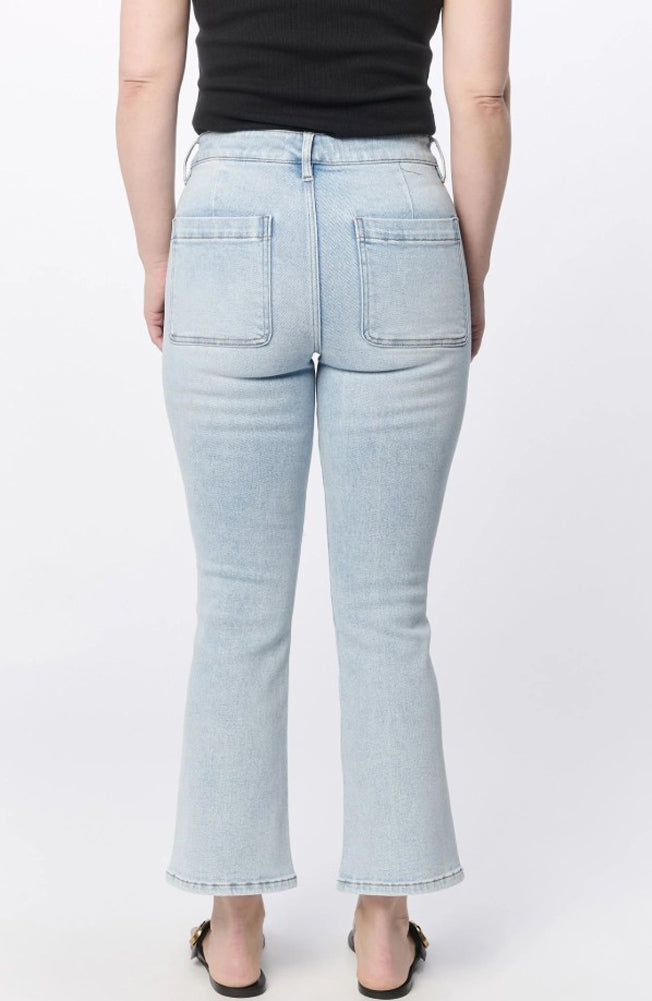 Effortless Everyday Style: High-rise cropped flare jeans in a light wash, featuring front patch pockets and a flattering fitted silhouette — perfect for casual comfort with a touch of retro flair.