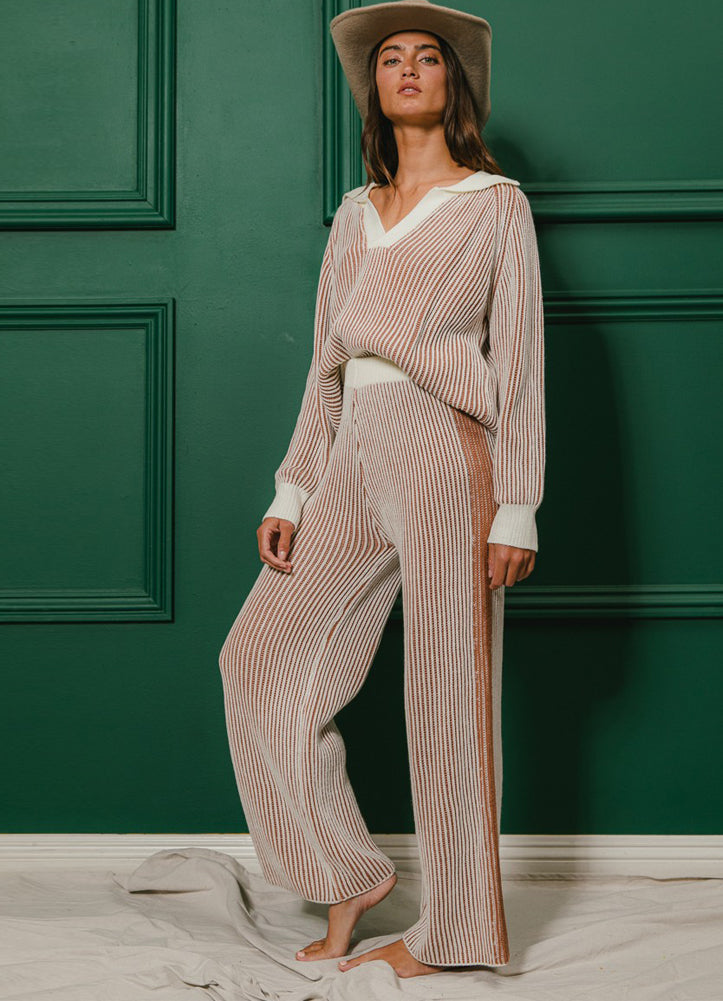 Two Tone Rib Texture Collared Sweater and Pant Set in Ivory/Cinnamon by BiBi