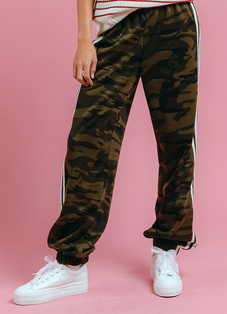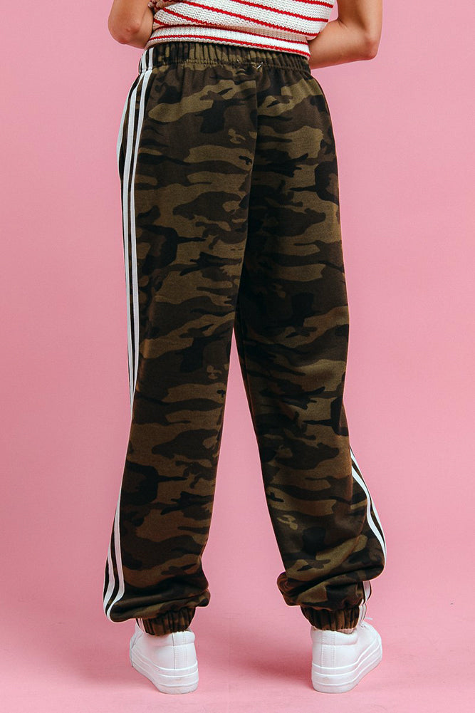 These trendy camouflage jogger pants feature a relaxed fit with elastic cuffs, sporty side stripes, and a soft, comfortable fabric blend — perfect for casual outings or lounging in effortless style.