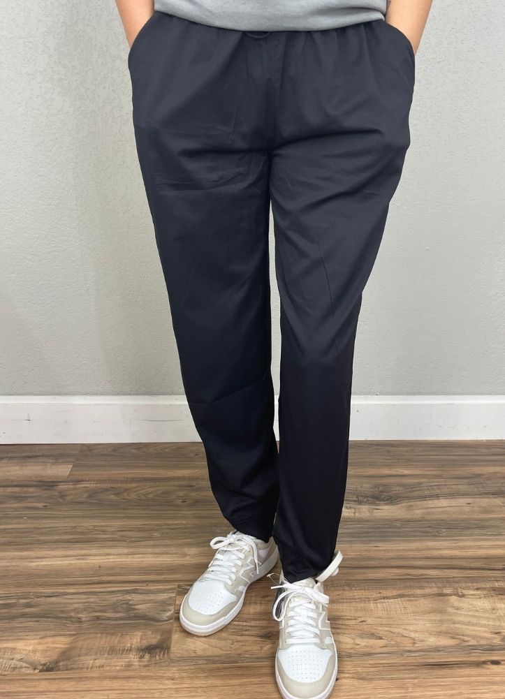 Keep it sleek and comfortable with these black pull-on pants, featuring a relaxed fit and elastic waistband for all-day ease. Designed with side pockets and a straight-leg silhouette, they offer a versatile look that can be dressed up with blouses or kept casual with tees and sneakers. A wardrobe staple, these pants bring effortless style to any occasion.
