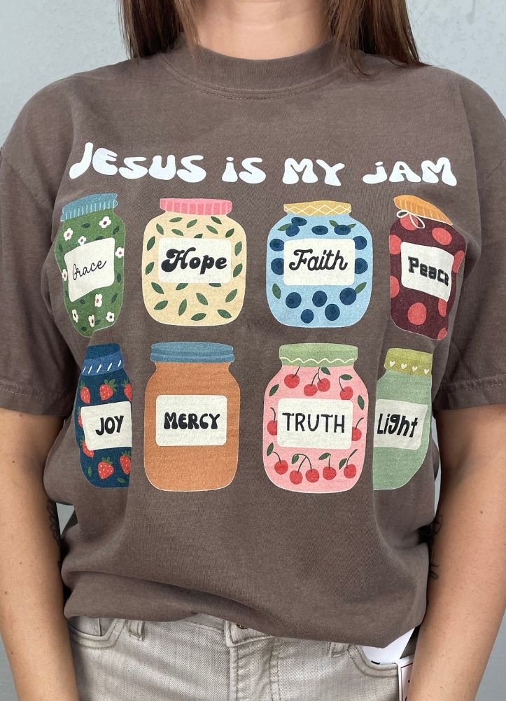 Spread positivity in this playful graphic tee featuring the phrase “Jesus is My Jam” with colorful illustrated jam jars labeled Grace, Hope, Faith, Peace, Joy, Mercy, Truth, and Light. Made from soft cotton with a relaxed fit, this brown t-shirt combines comfort with inspiration. Perfect for casual days, it pairs effortlessly with jeans, shorts, or skirts for a fun, faith-filled look.