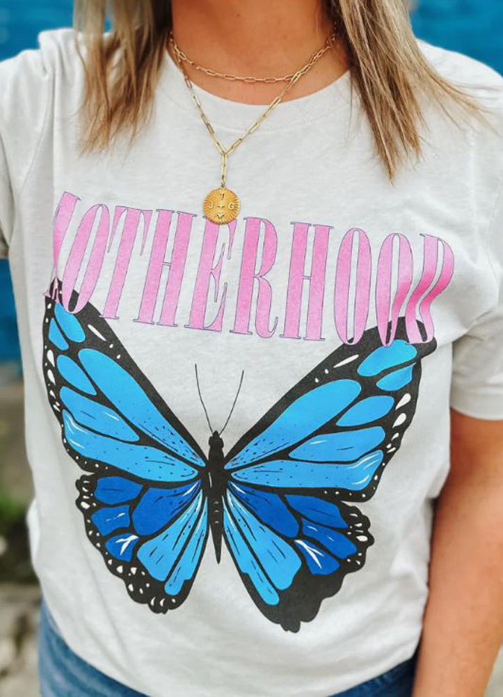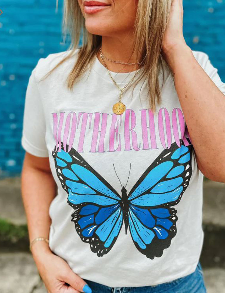You are sure to love this motherhood tee. Featuring a rounded neck and short sleeves it says "motherhood" in pink with a blue butterfly on a light beige tee. It pairs great with any color wash of jeans or shorts.