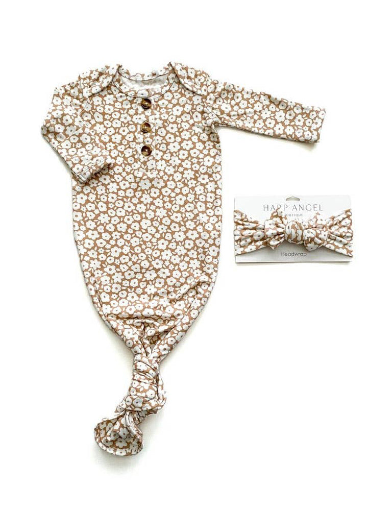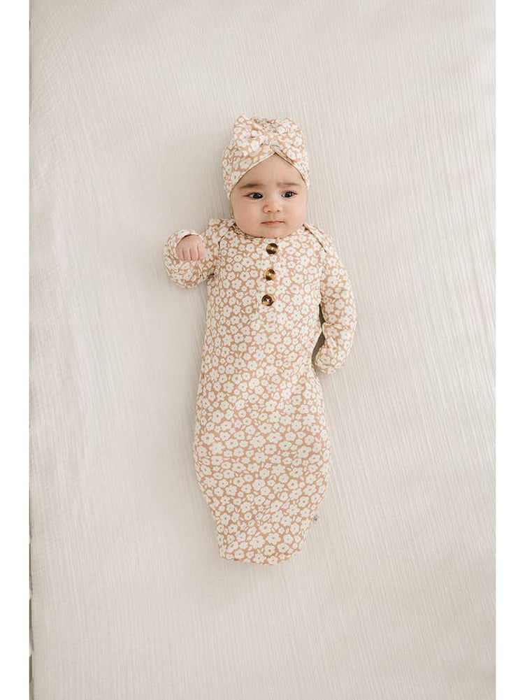 Your little one will be all snuggled up in sweetness with this adorable ditsy floral gown and matching turban set. Featuring a soft, stretchy fabric and functional wooden buttons, this knotted gown makes diaper changes quick and easy while keeping baby cozy. The coordinating turban adds the perfect finishing touch for a picture-perfect look. Ideal for newborn snuggles, hospital photos, or baby shower gifts!