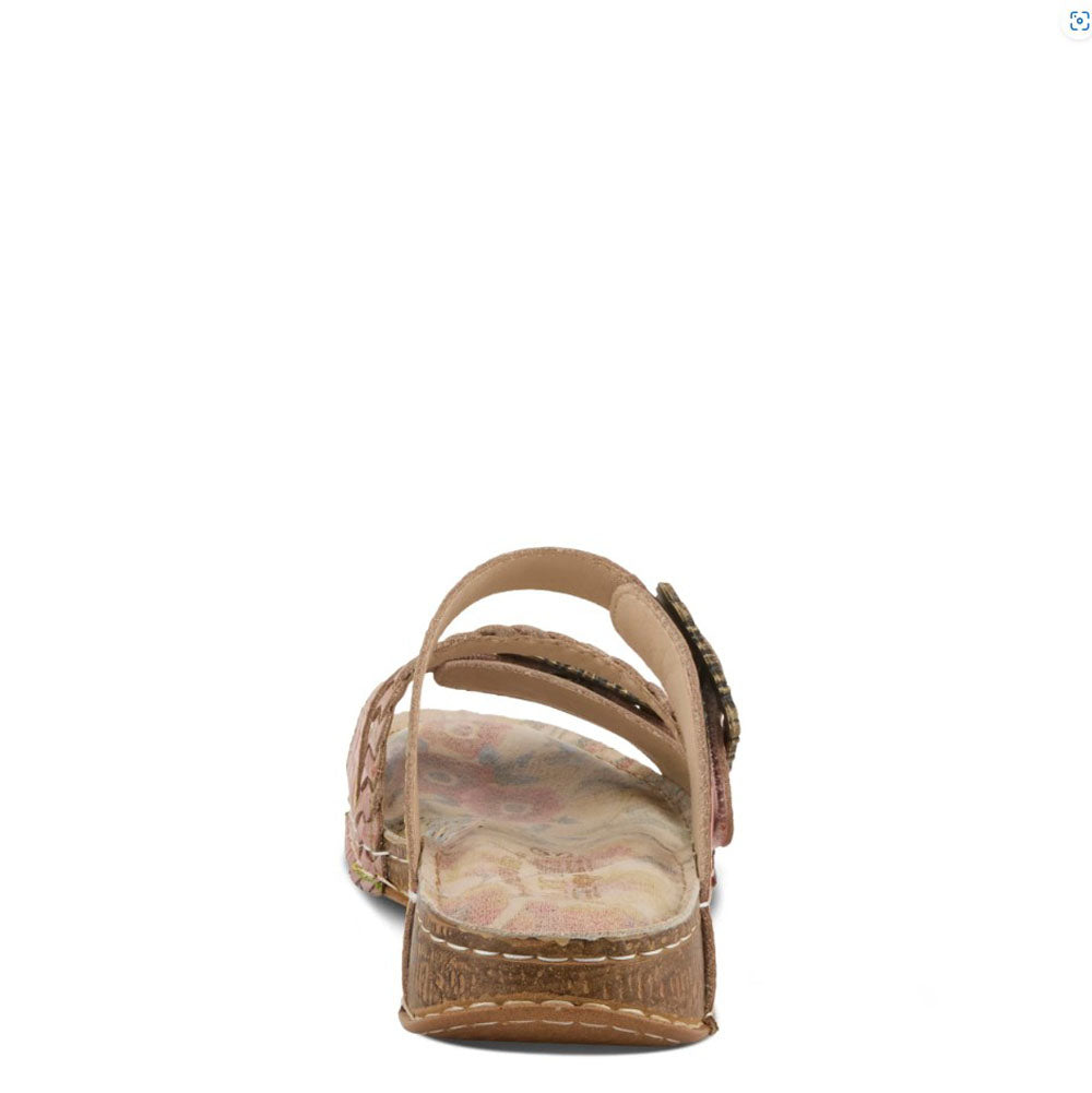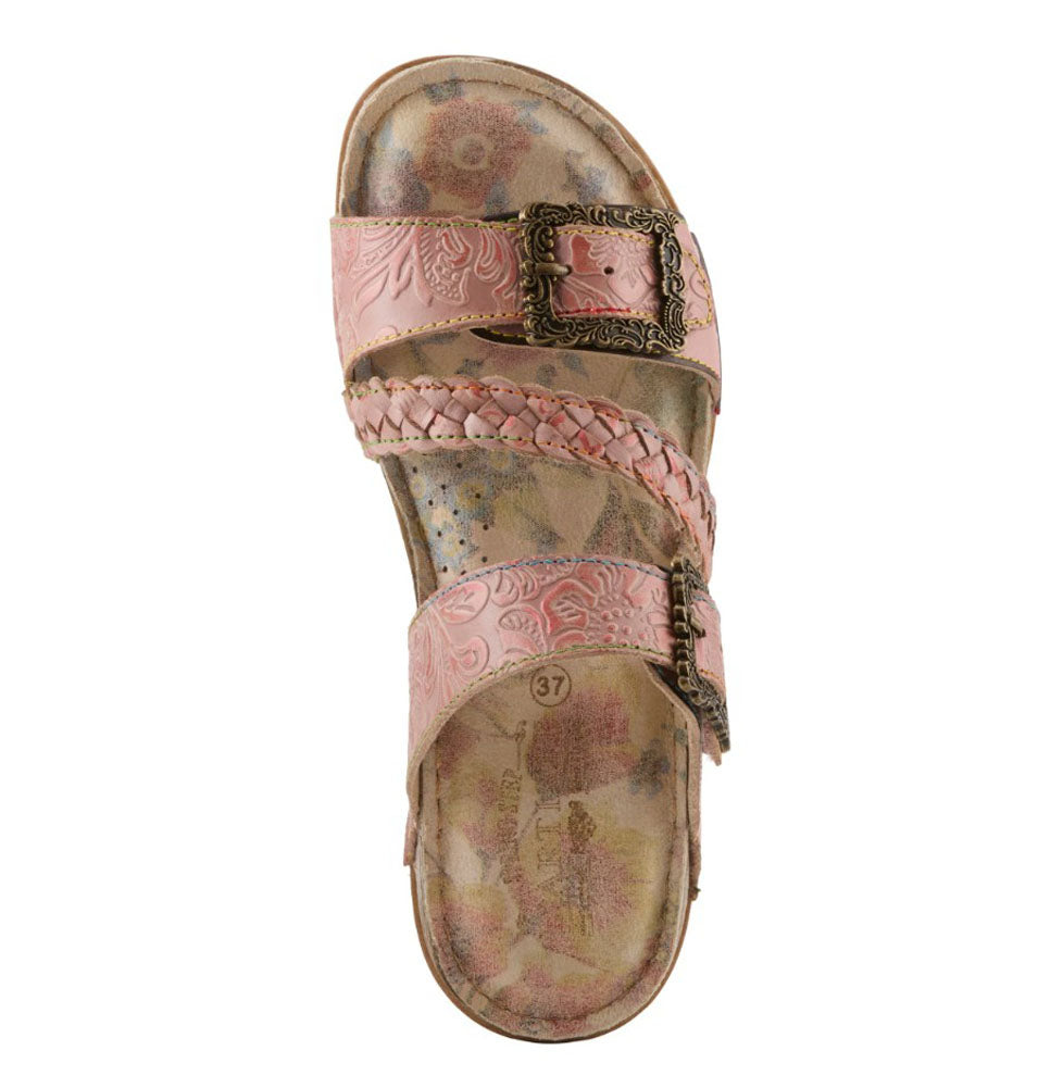 Slip on these beautiful botanical inspired, hand painted leather slides, built with comfort in mind. The corked sandal has double hook and loop Velcro closure across the toe and at the ankle, paired with an antiqued embossed buckle for fashionable leisure.