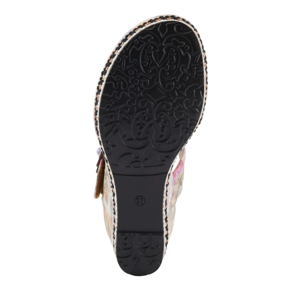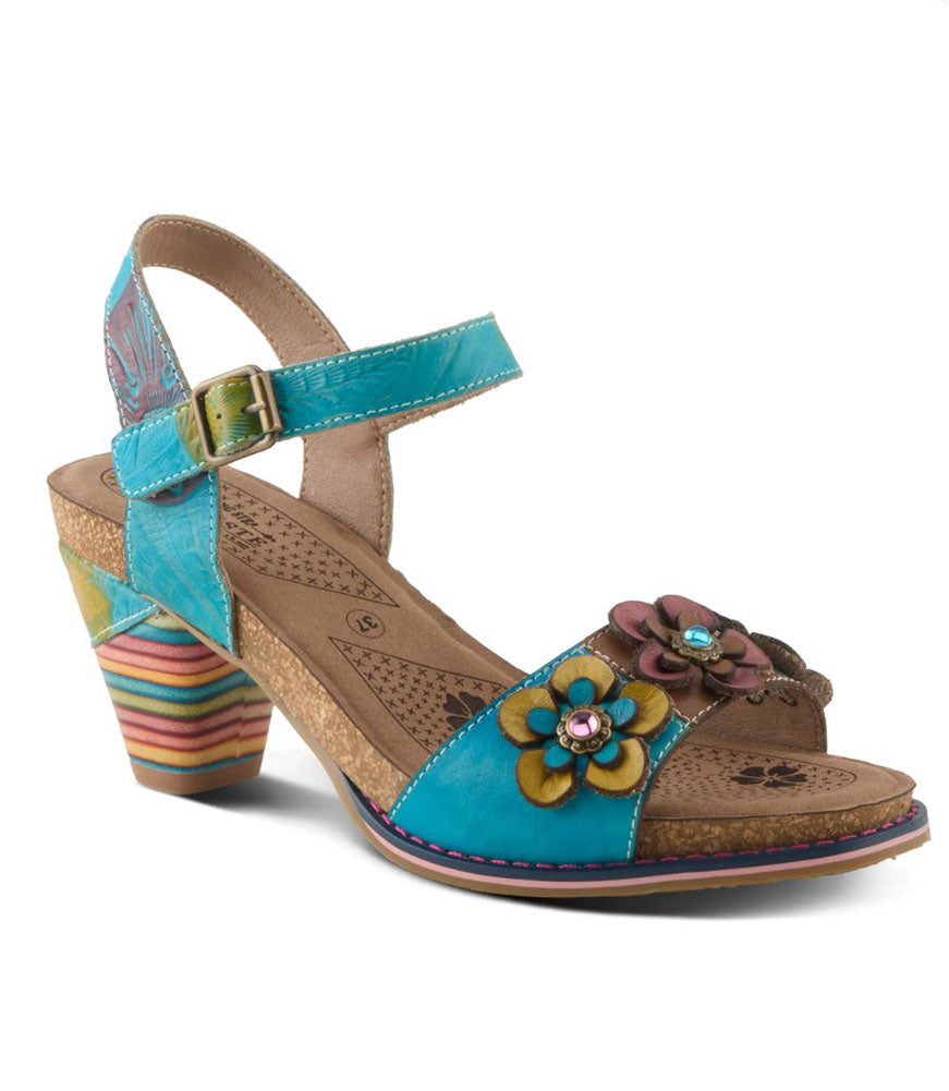 Blossom with style in the BLUESKY sandal. Featuring a leather upper adorned with a vibrant array of two-toned floral appliques, this open-toe beauty is a work of art for your feet.