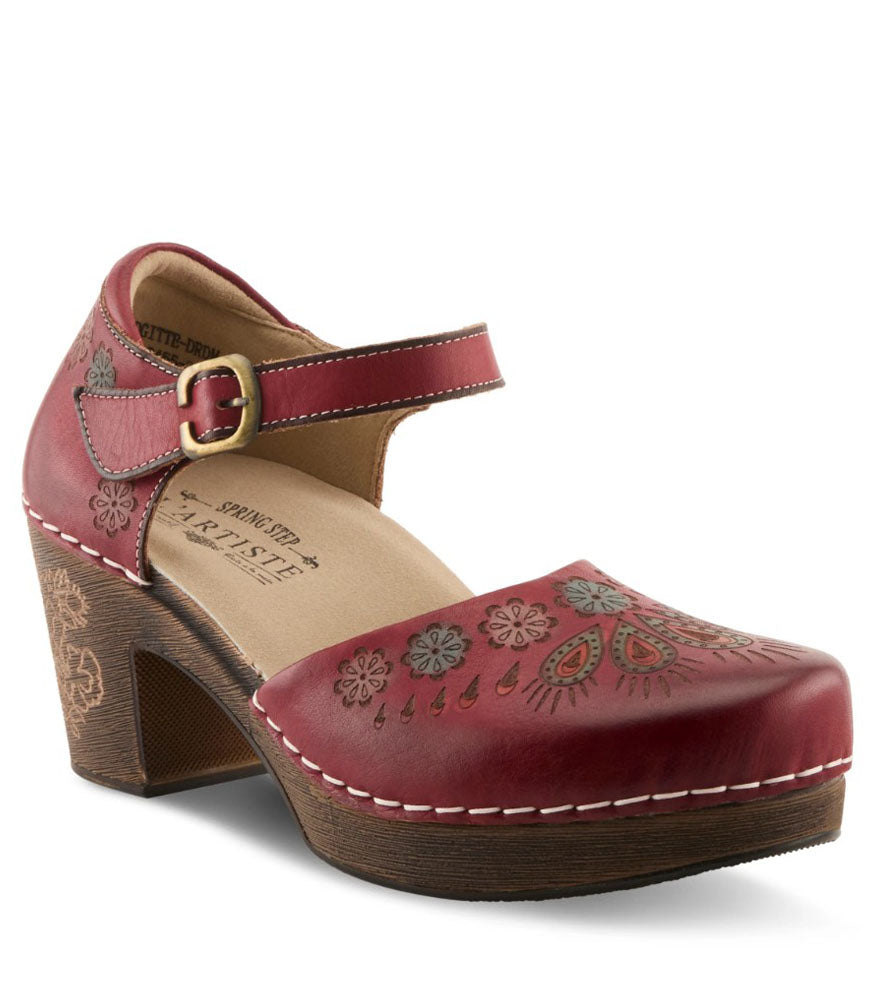 Add a touch of artistic charm to your everyday look with this beautifully designed leather Mary Jane shoe. Crafted in a rich red hue, it features delicate hand-tooled floral detailing across the toe for a unique, eye-catching finish. The adjustable strap ensures a secure and comfortable fit, while the cushioned insole provides all-day support. Perfect for casual outings or dress-casual wear, this shoe blends comfort, craftsmanship, and timeless style effortlessly.