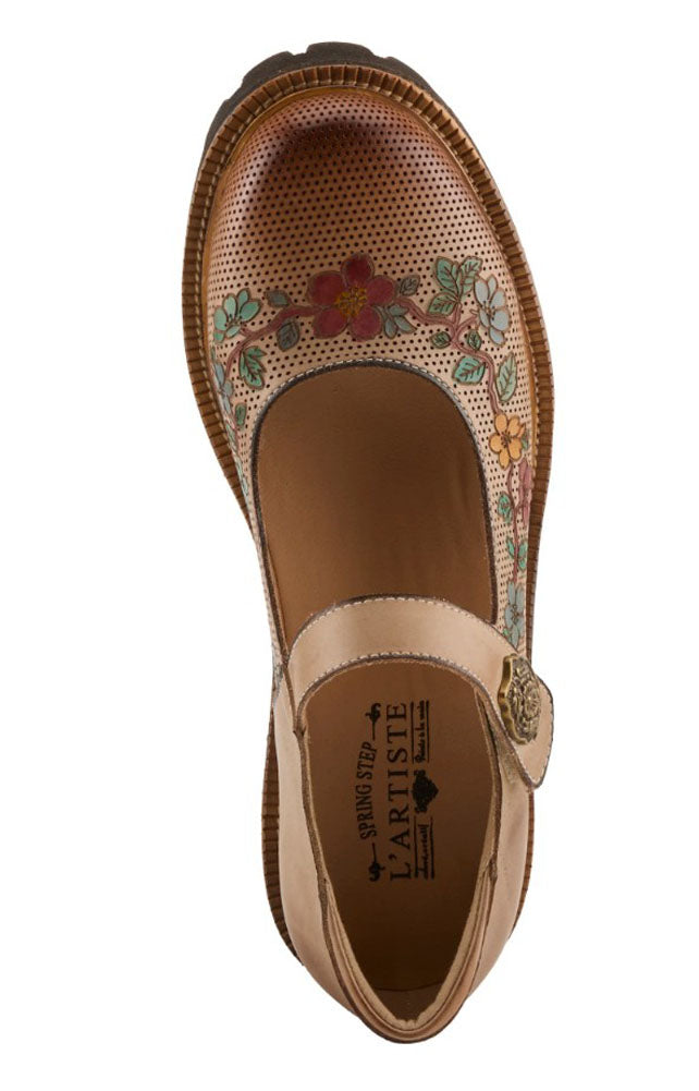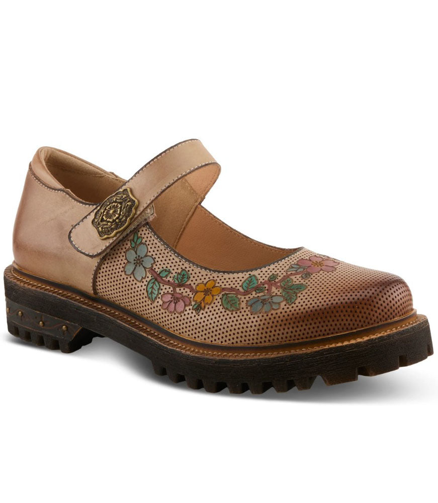This elegant Mary Jane style shoe is designed with soft tan leather and a breathable perforated upper, beautifully accented by a hand-painted floral pattern across the toe. The adjustable strap with decorative metal hardware ensures a secure fit, while the cushioned interior and sturdy sole provide lasting comfort and support. A perfect blend of craftsmanship, femininity, and everyday practicality.