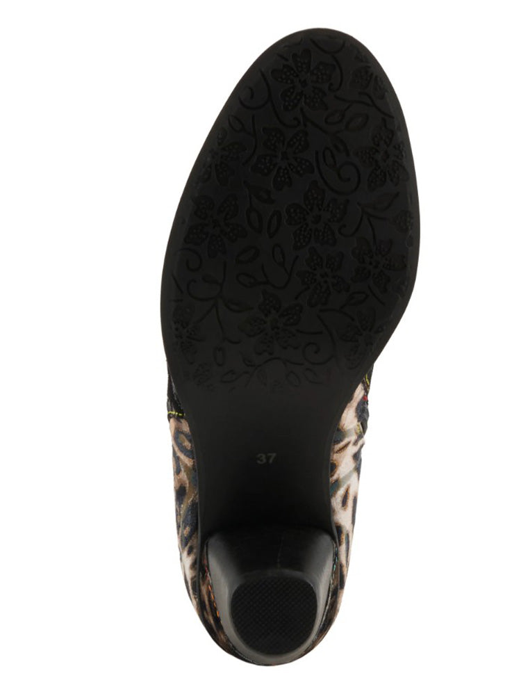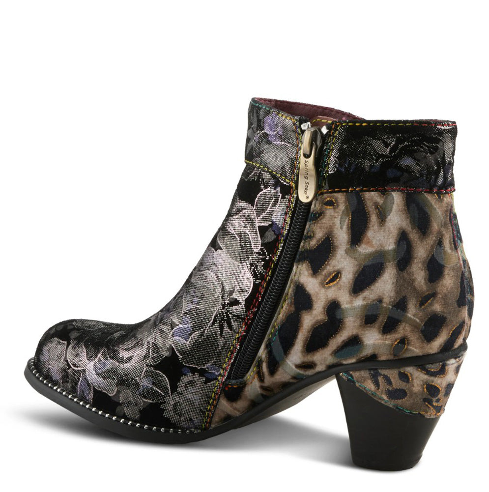 Turn heads with the bold beauty of our Dessalynn Pewter Floral Ankle Boot, a statement piece that blends sophistication with artistic flair. The boot features a luxurious velvet-like finish adorned with metallic floral designs in shades of pewter, silver, and blue, complemented by a leopard inspired heel panel for a daring contrast. A decorative antique gold button adds a vintage touch, while the stitched detailing enhances its handcrafted appeal.