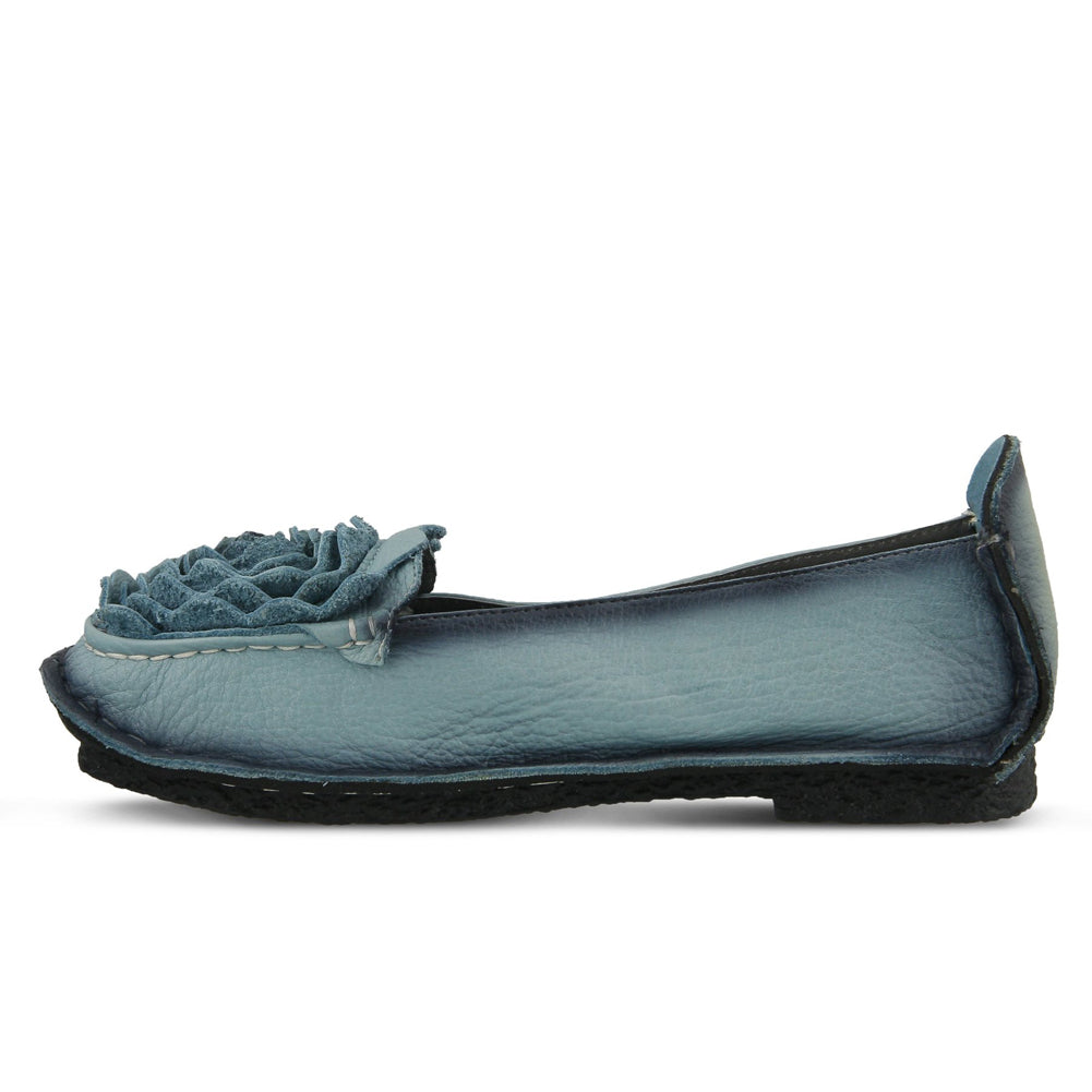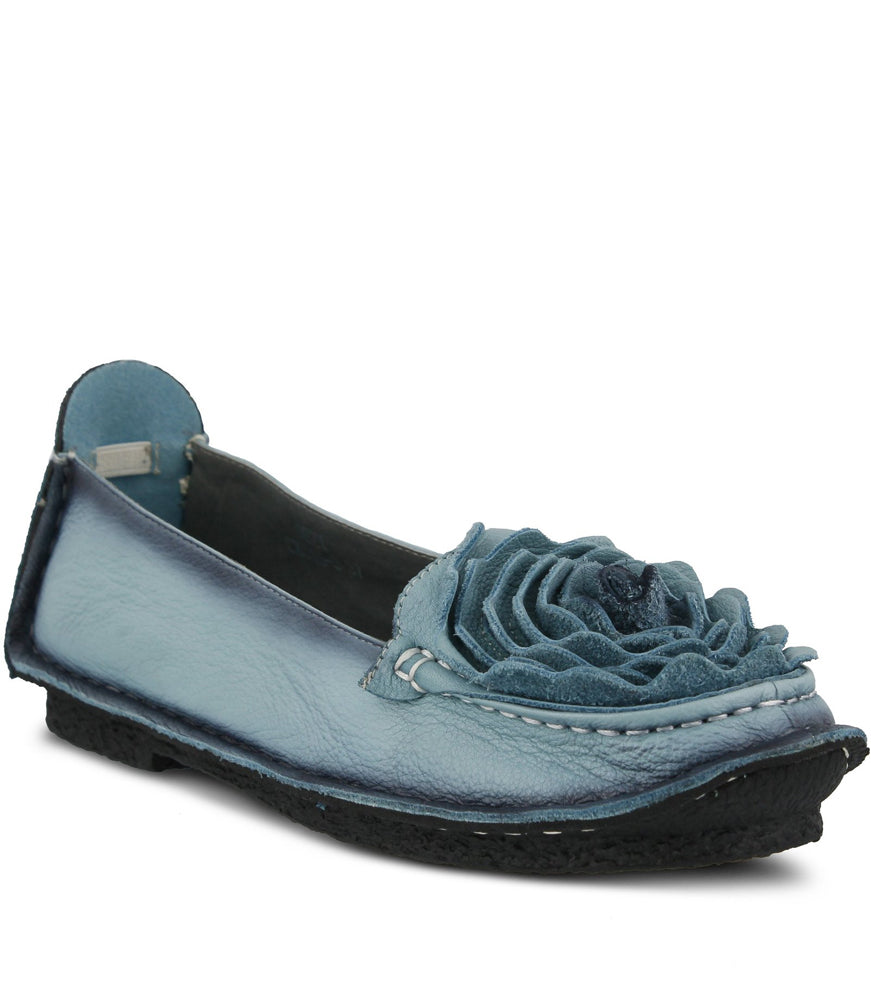 L'Artiste brings us the Dezi slip on ballet flat in blue leather This hand painted ombre leather upper features a matching flower on the toe. It is a beautiful shoe sure to attract attention.