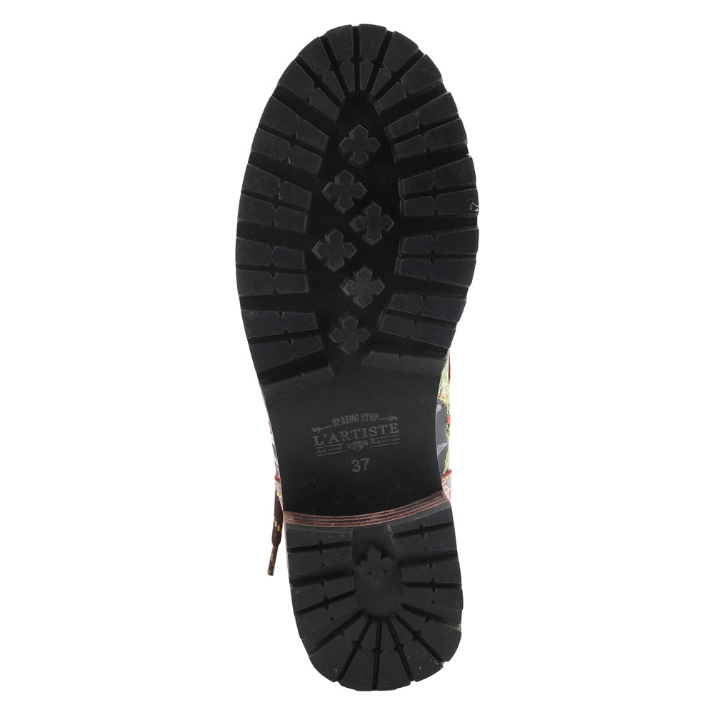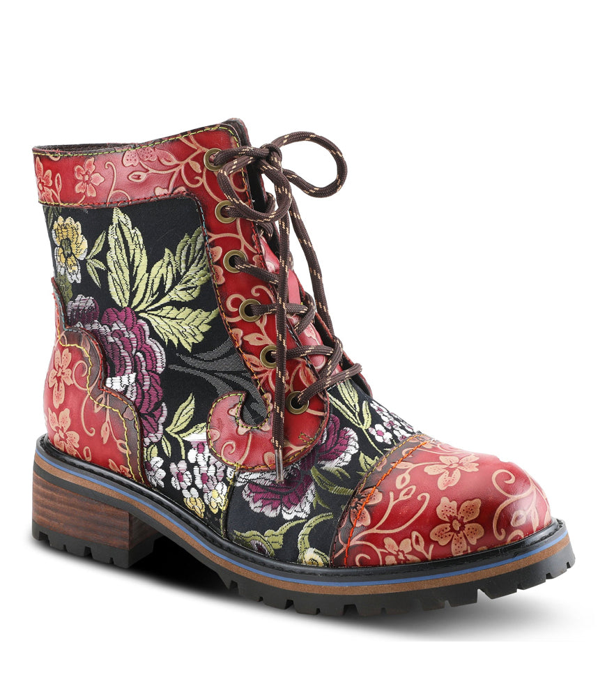 L'Artiste brings us high quality, vintage inspired leather shoes! This Fantastic boot comes in the color Red and features an embossed leather of a fun floral print. It has a comfort lug sole and lace up design.