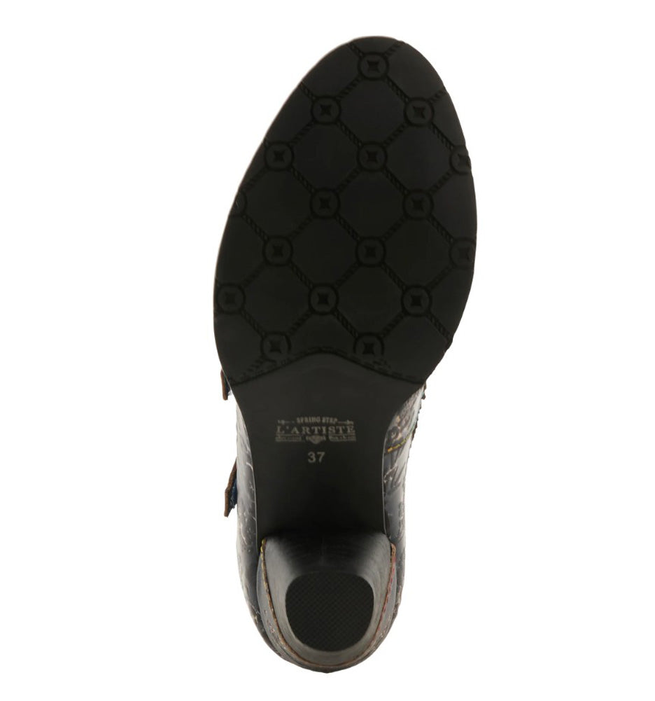 Charming, feminine, and full of personality. The Garviria Navy Embossed Mary Jane Heel brings a vintage inspired touch to your modern wardrobe. Crafted in rich navy leather with delicate floral embossing and colorful contrast stitching, this shoe combines artistry with everyday comfort. The double Mary Jane straps provide a secure fit, while the scalloped edging and intricate heel detailing add a hint of playful elegance.