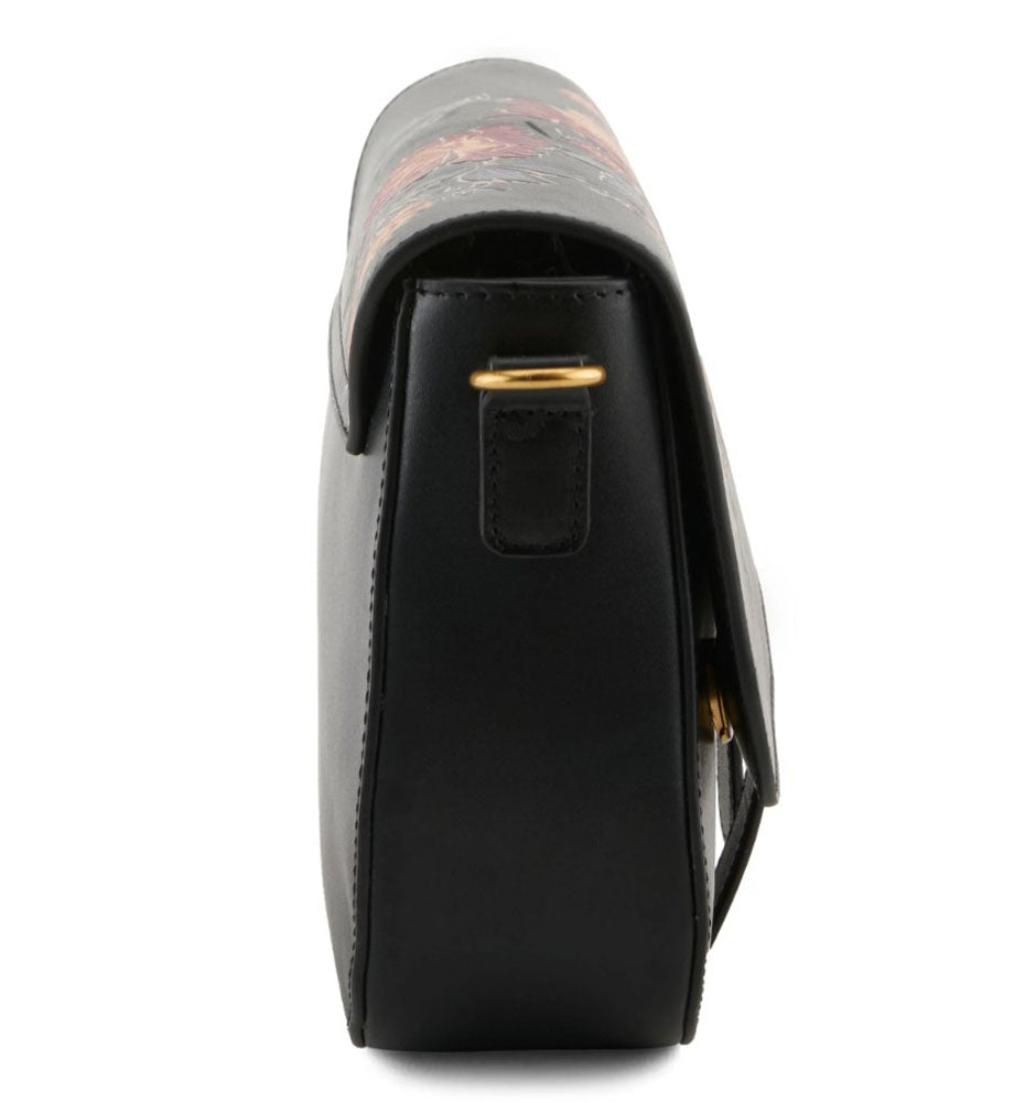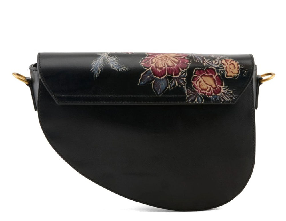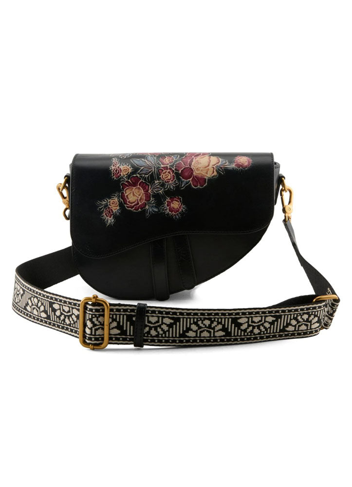 Elevate your everyday look with this statement crossbody bag, designed to blend artistry with effortless function. Crafted in a sleek saddle-inspired silhouette, it features a beautifully detailed floral motif across the front flap for a touch of feminine charm. The adjustable woven strap adds texture and contrast while offering comfortable, hands-free wear. Finished with polished hardware and a secure flap closure, this versatile bag is perfect for day-to-night styling. Whether you're running errands, traveling, or heading out for an evening out.