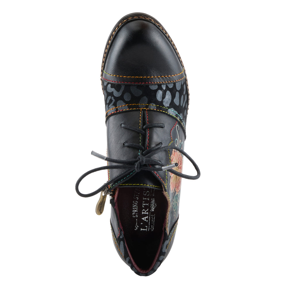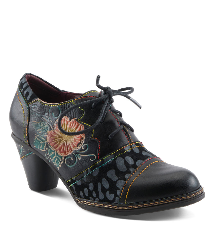 Bold and artistic, this black leather lace-up heel features hand-painted floral detailing, contrast stitching, and a sculpted block heel. Blending vintage character with modern comfort for a standout statement look.