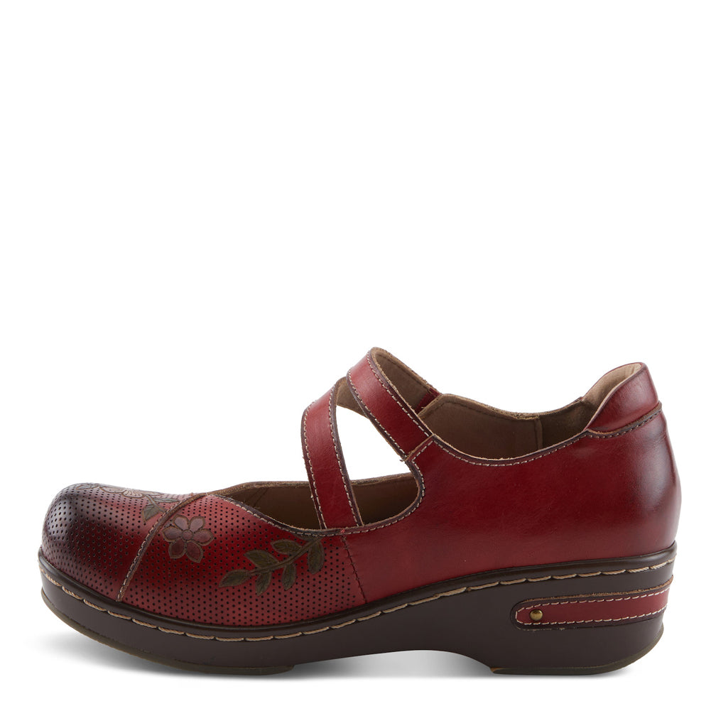 Crafted in deep red leather, this Mary Jane features embossed floral accents, perforated detailing, and dual adjustable straps on a supportive low wedge sole. Balancing everyday comfort with feminine charm.