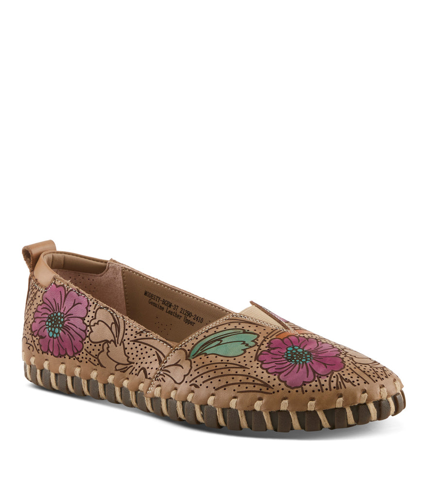 Light and versatile, this tan leather slip-on features hand-painted floral designs in vibrant hues, perforated detailing, and a flexible stitched sole for effortless comfort and everyday wear with artistic flair.