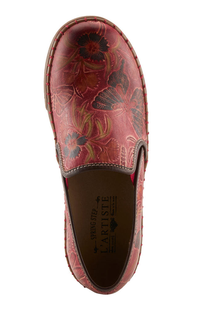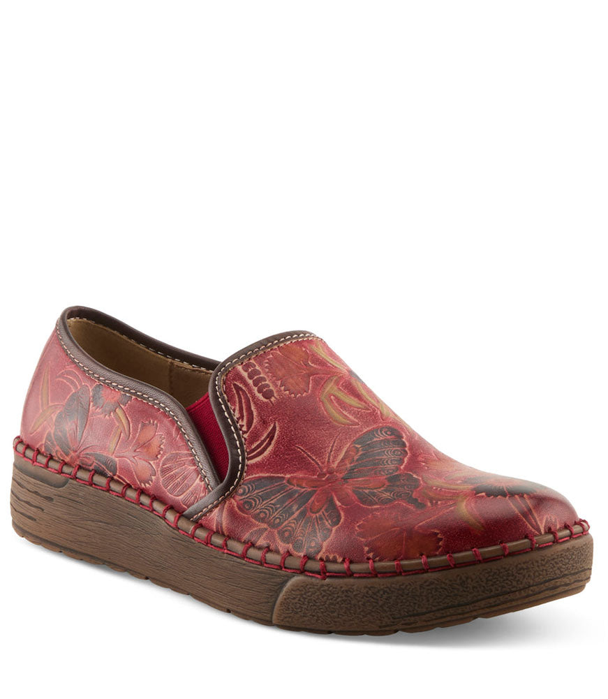 Step into effortless comfort and eye-catching style with this beautifully crafted slip-on, designed for those who appreciate artistry in every detail. The rich red leather upper is adorned with an intricate embossed butterfly motif, creating a vibrant, nature-inspired design that instantly stands out. Hand-stitched detailing along the edge enhances the handcrafted aesthetic while adding durability and charm. Elastic side panels ensure easy on-and-off wear, offering a flexible, secure fit ideal for busy days on the go. The cushioned insole and lightweight, textured sole provide exceptional comfort and support, making this shoe perfect for all-day wear. Whether paired with your favorite jeans, casual dresses, or cozy weekend outfits, this slip-on adds a burst of color and personality to any look. Thoughtfully designed and beautifully made, it blends comfort, creativity, and practicality, making every step feel as good as it looks.