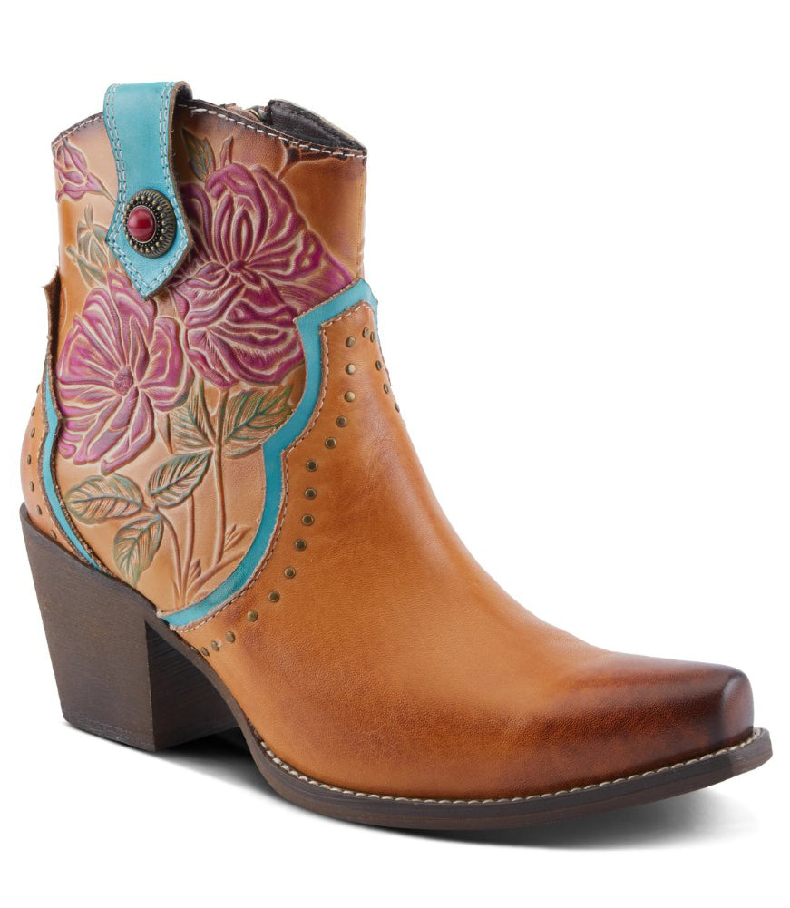Channel southwestern flair with these tan leather ankle boots—featuring intricate floral embossing in rich rose hues, turquoise trim, antique brass studs, and a vintage button accent for a bold, feminine twist on western style.