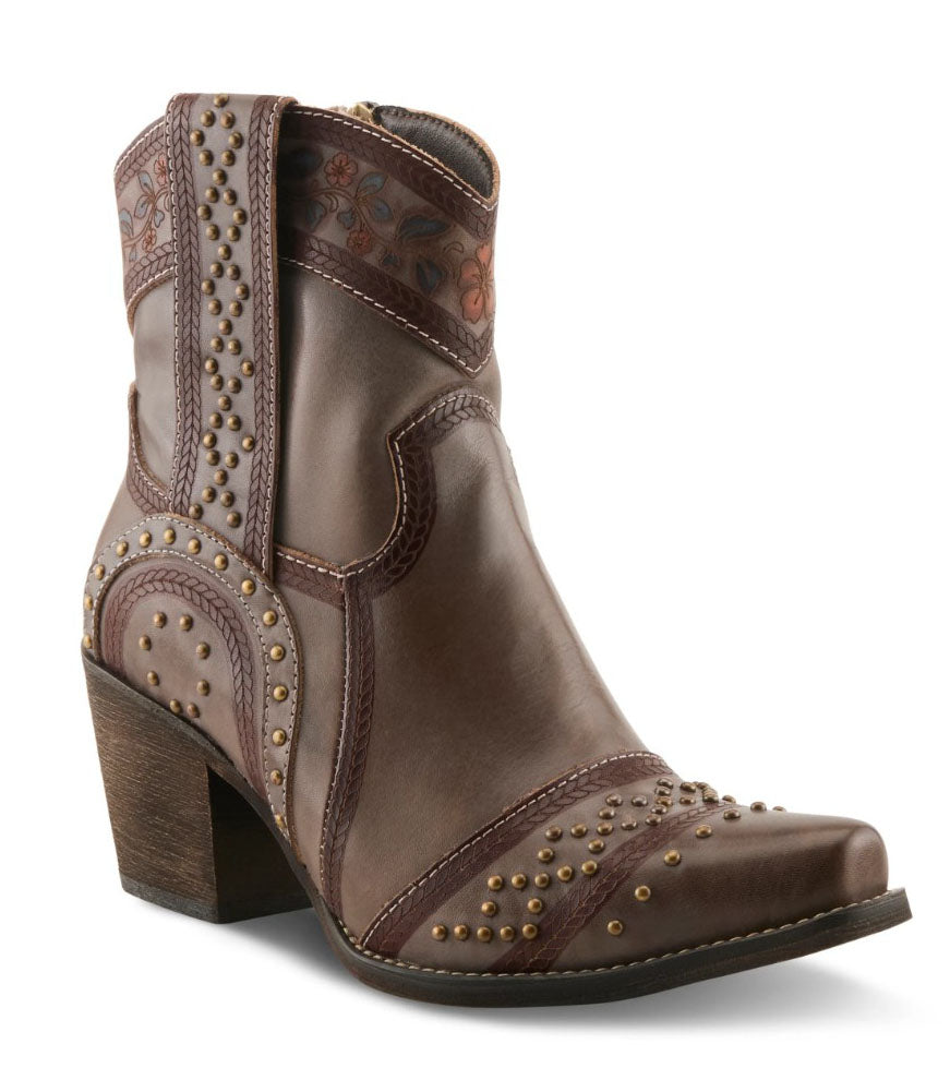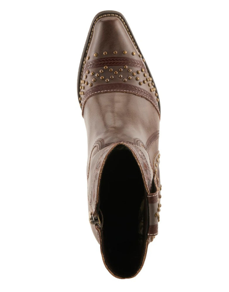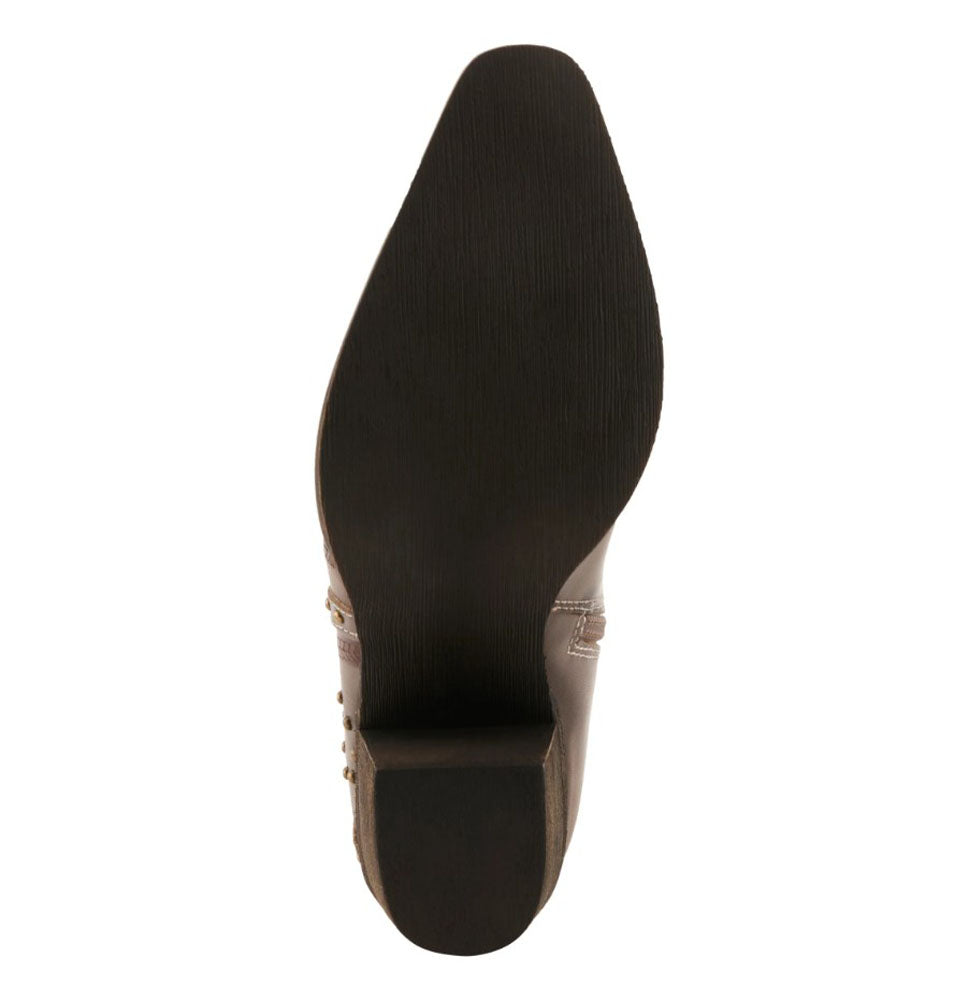 This beautifully crafted ankle boot showcases rich brown leather with layered paneling and detailed contrast stitching for a timeless western-inspired look. Decorative metal studs add texture and character, while the stacked heel provides stability and everyday comfort. Finished with a sleek almond toe and durable sole, this boot is perfect for dressing up casual outfits with rugged elegance.