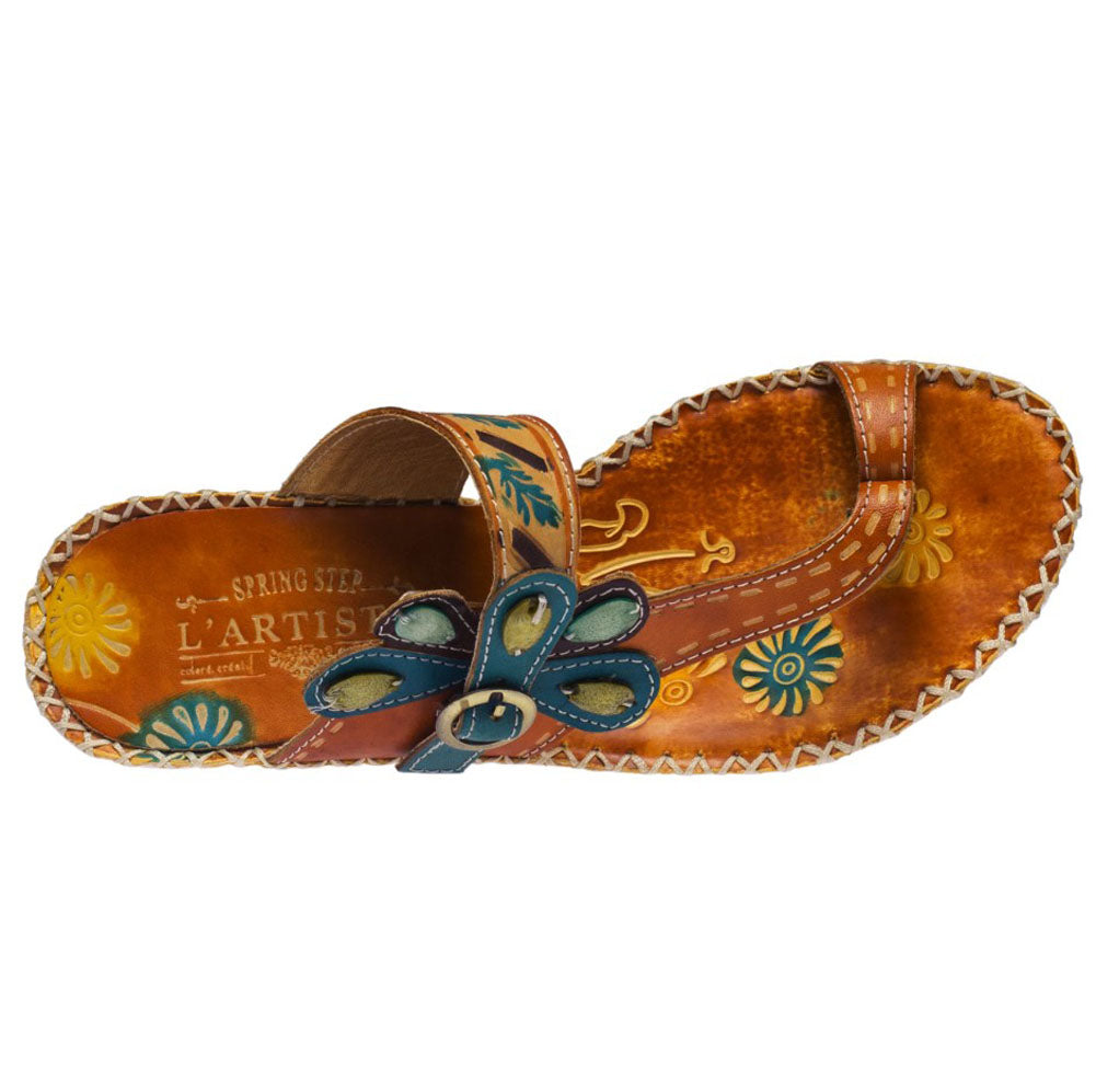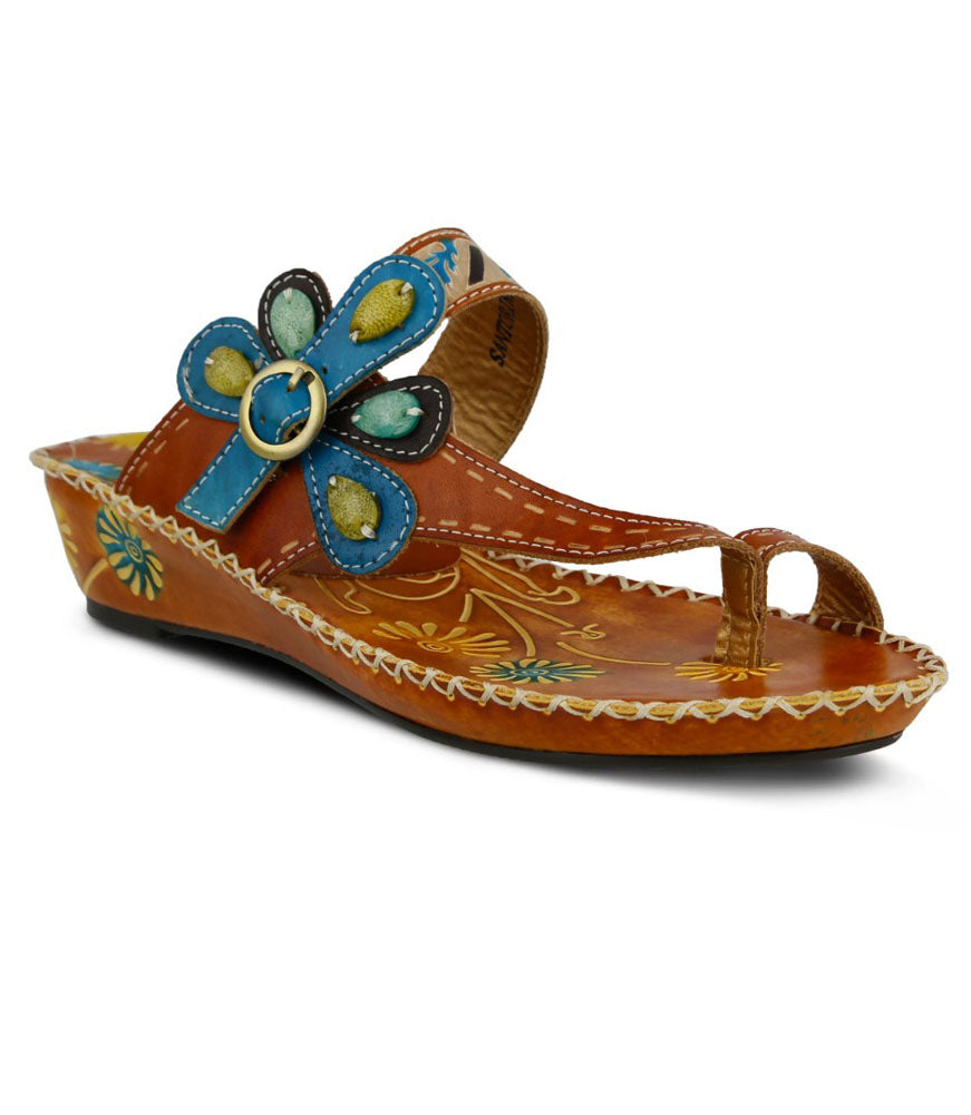 This French inspired design, is hand painted leather toe-ring thong sandal featuring a jeweled tear drop stones. It has a floral embossed insole, with an adjustable strap with buckle closure.