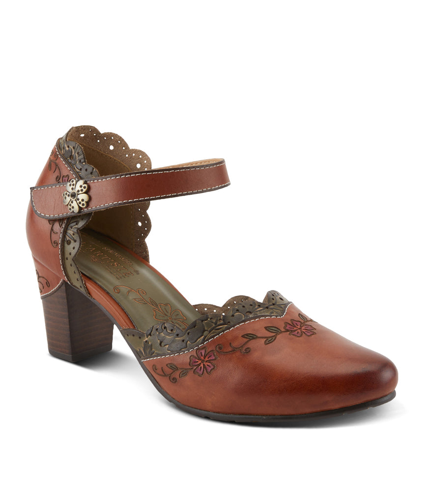 Delicately refined, this dark brown leather pump features scalloped edges, embroidered floral accents, and an antique-inspired buckle strap, all set on a block heel that blends vintage grace with modern comfort.