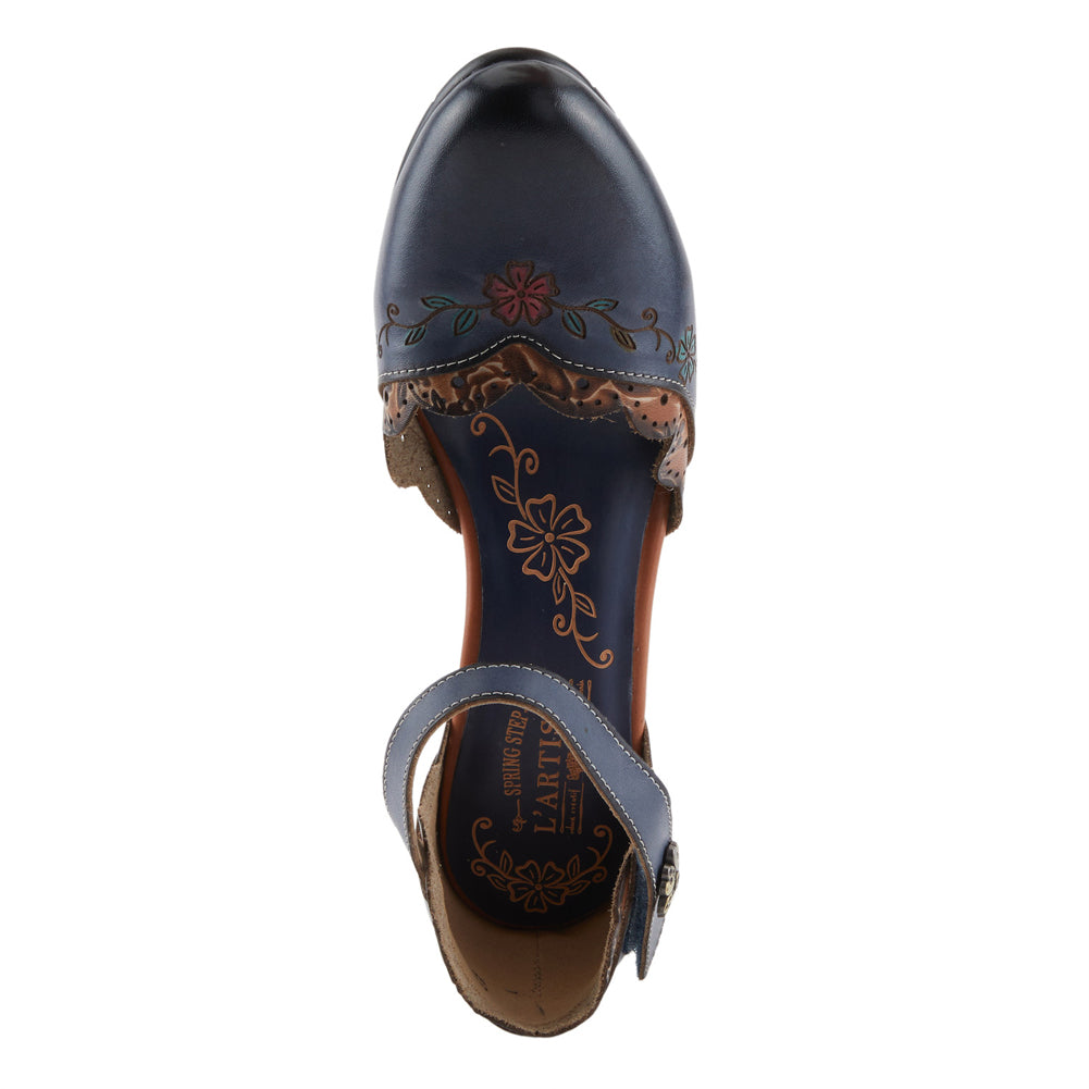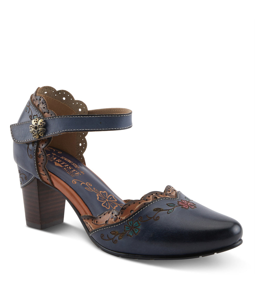 Delicately refined, this navy leather pump features scalloped edges, embroidered floral accents, and an antique-inspired buckle strap, all set on a block heel that blends vintage grace with modern comfort.