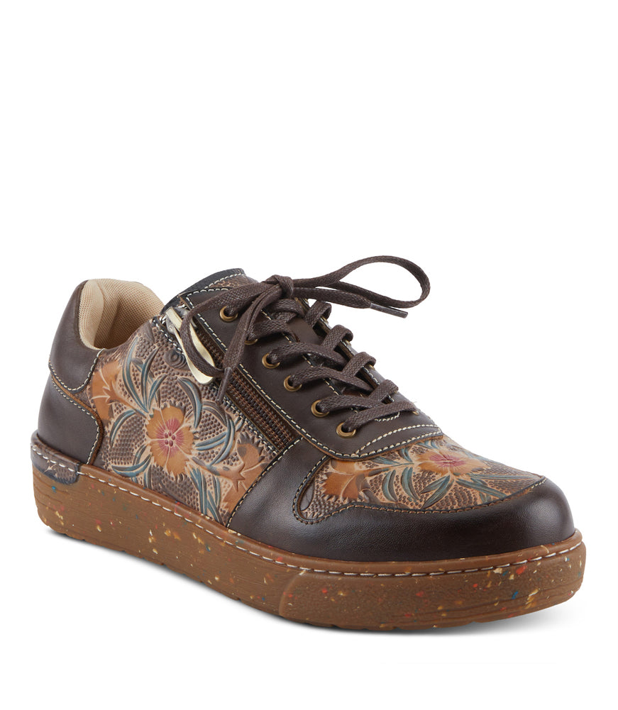 A perfect balance of casual comfort and artisan detail, this brown leather sneaker features embossed floral panels, a convenient side zipper, and a speckled platform sole that adds modern flair to everyday wear.