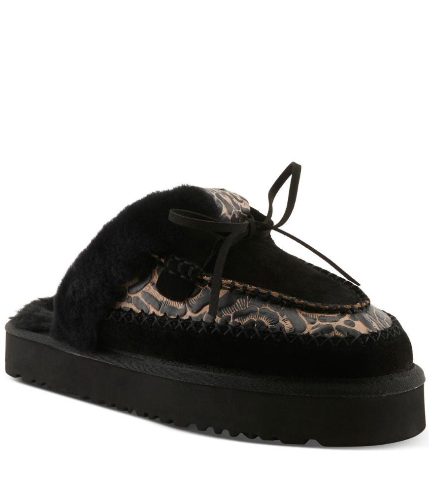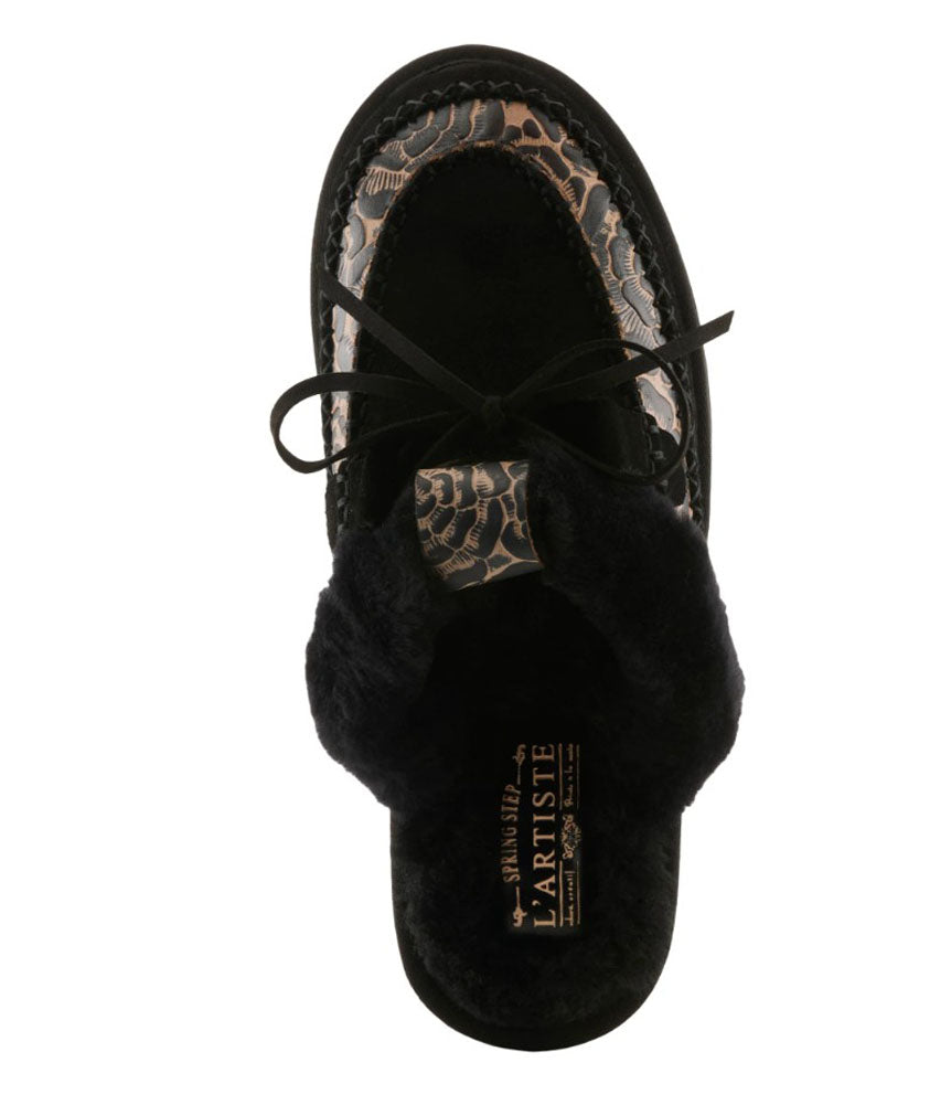 This cozy slip-on mule blends comfort with distinctive style. Designed with a plush faux-fur lining, it keeps feet warm and cushioned, while the suede-like upper features an intricate embossed pattern for added visual interest. Finished with a thick, durable sole and decorative lace detail, this shoe is perfect for relaxed everyday wear with a touch of artisan charm.