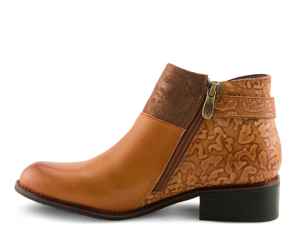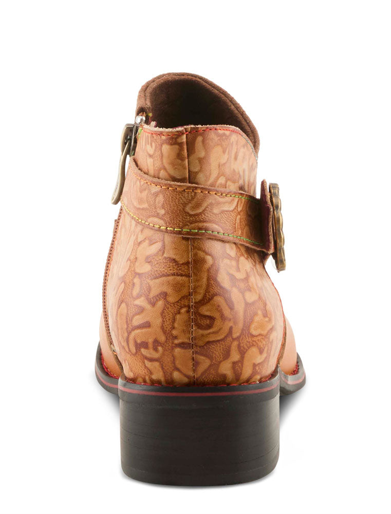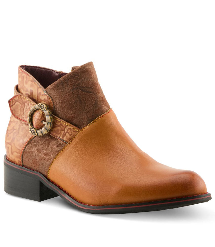 Bring artisan-inspired charm to your everyday style with this beautifully crafted ankle boot, designed to blend comfort, character, and standout detail. The rich caramel leather front offers a smooth, polished look, while the textured suede and patterned leather panels in the back add depth, warmth, and visual contrast. An antique-inspired floral buckle completes the design, giving the boot a rustic elegance that feels both modern and timeless. The low block heel provides stability and all-day comfort, making this boot perfect for work, weekends, and everything in between. Thoughtful stitching, a soft interior lining, and durable construction ensure long-lasting wear, while the unique mix of materials lends a handcrafted feel that sets this style apart. Versatile and eye-catching, this ankle boot pairs effortlessly with jeans, dresses, and layered fall outfits—bringing personality and charm to every step.