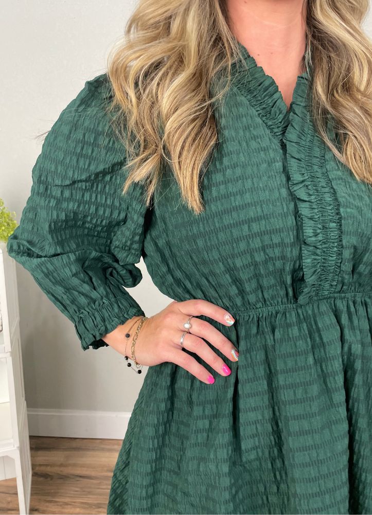 Effortlessly chic, this emerald green midi dress features a textured fabric, ruffled hemline, and flattering elastic waist. The gathered neckline and 3/4 balloon sleeves add a touch of elegance, making it perfect for day-to-night wear, holiday parties, or casual gatherings with a dressy twist.