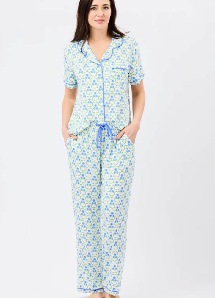 Comfort meets classic style in this beautifully coordinated pajama set. Featuring a soft white backdrop adorned with a delicate blue and green geometric floral print, it offers a fresh and timeless look. The short-sleeve button-front top is accented with contrast blue piping along the collar, placket, and pocket, adding a polished touch to its relaxed silhouette. The matching full-length pants feature a comfortable drawstring waistband and convenient side pockets, ensuring an easy, adjustable fit for lounging or sleeping. Crafted from lightweight, breathable fabric, this set feels soft against the skin while keeping you cool and comfortable throughout the night. Perfect for unwinding after a long day or enjoying slow, cozy mornings at home, it blends effortless charm with everyday practicality. Stylish yet comfortable, this pajama set brings a refined look to your relaxation routine while keeping comfort at the forefront.