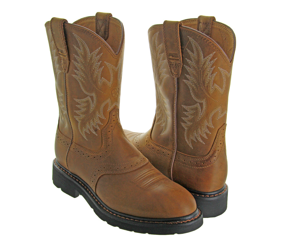 These Sierra Saddle Agedbark by Ariat work boots feature Ariat's ATS stability system, oil and slip resistant outsole, extreme heat and abrasion resistance, premium leather upper, and ergonomic support