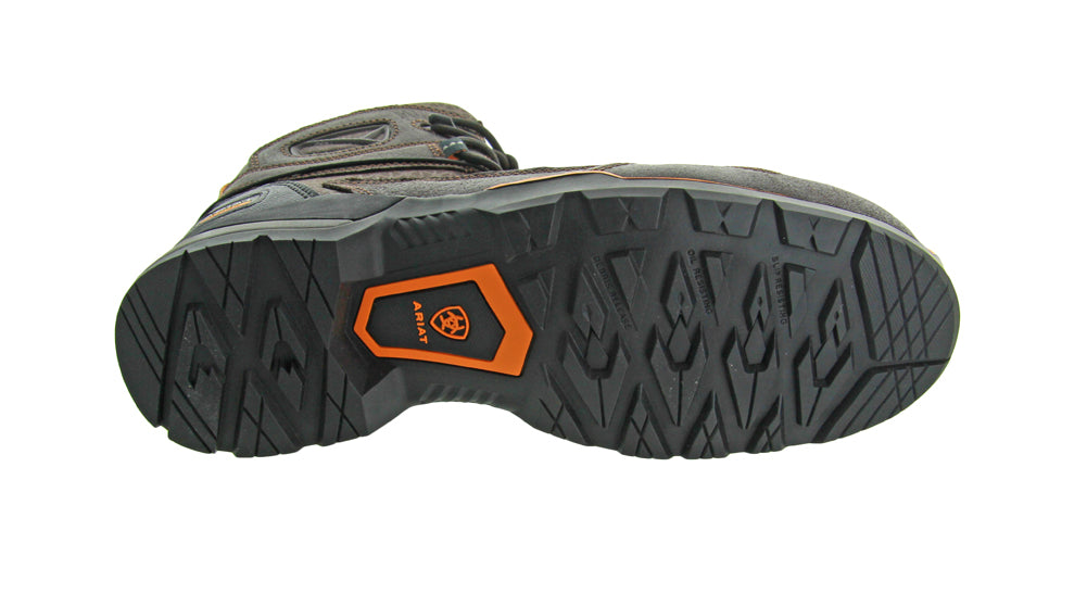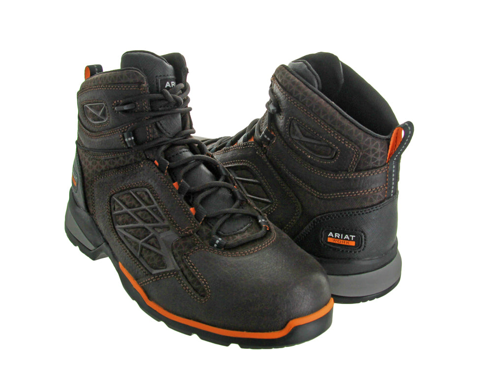 These Rebar Flex 6" CT Chocolate Brown by Ariat work boots feature a leather and mesh upper, lace up closure, mesh lining, hidden cushioning midsole, padding at the heel, and oil and slip resistant rubber sole with debris release tread design.