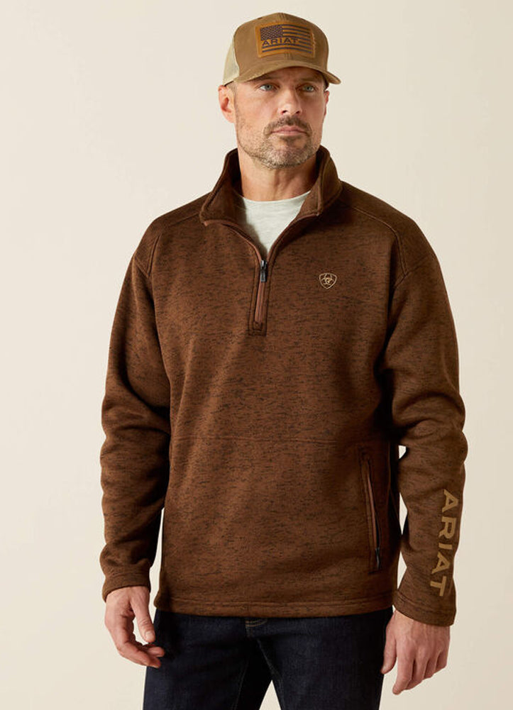 This Ariat men's quarter zip pullover in rich heathered brown offers casual comfort with a modern edge, featuring a stand collar, zippered pockets, logo chest emblem, and bold sleeve branding. Perfect for layering, it blends warmth, style, and everyday versatility.