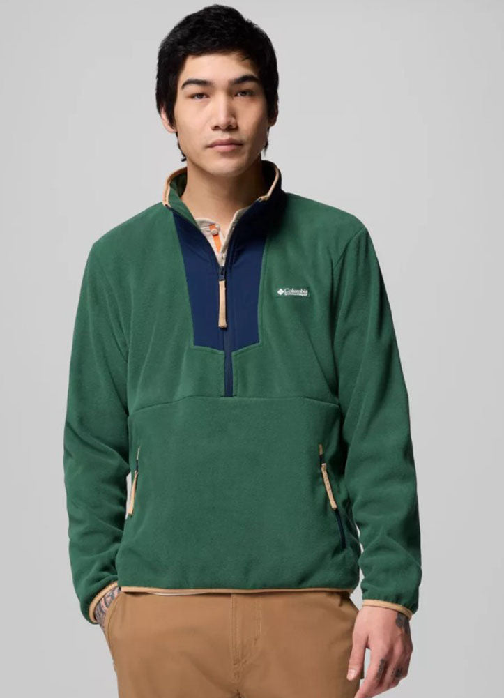 Elevate your outdoor style with the Columbia Men's Green Quarter-Zip Fleece Pullover, featuring a soft, warm design with contrast detailing and secure zip pockets, perfect for layering on hikes, travels, or casual everyday wear.