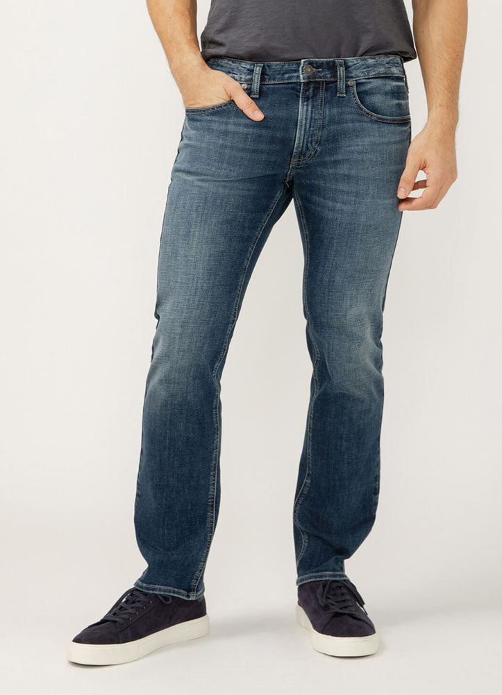 Classic and versatile, these straight-leg jeans feature a medium blue wash with subtle fading, a comfortable mid-rise fit, and just the right amount of stretch for all-day wear.