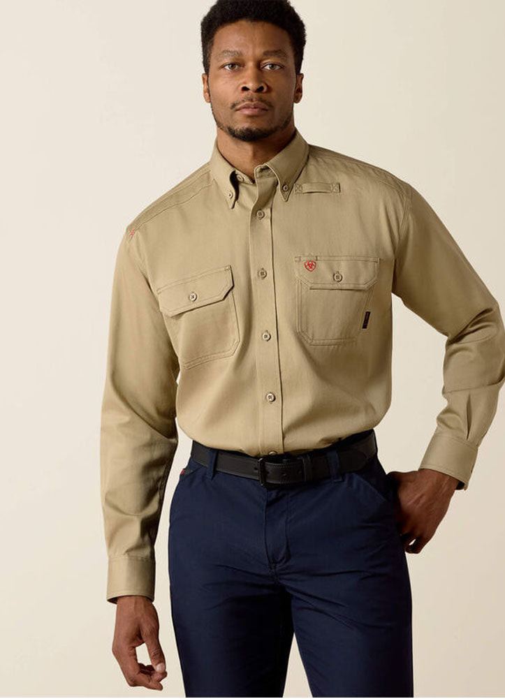 Upgrade your workwear with this premium long-sleeve utility shirt, designed for durability, comfort, and a clean, professional look. Crafted from sturdy yet breathable fabric, it features a structured button-down collar, reinforced shoulder detailing, and dual front flap pockets for functional storage. The tailored fit creates a sharp silhouette without restricting movement, making it ideal for long days on the job or polished everyday wear. Finished in a versatile khaki tone, this shirt pairs effortlessly with work pants, jeans, or uniforms. Delivering dependable performance and timeless style in one essential piece.