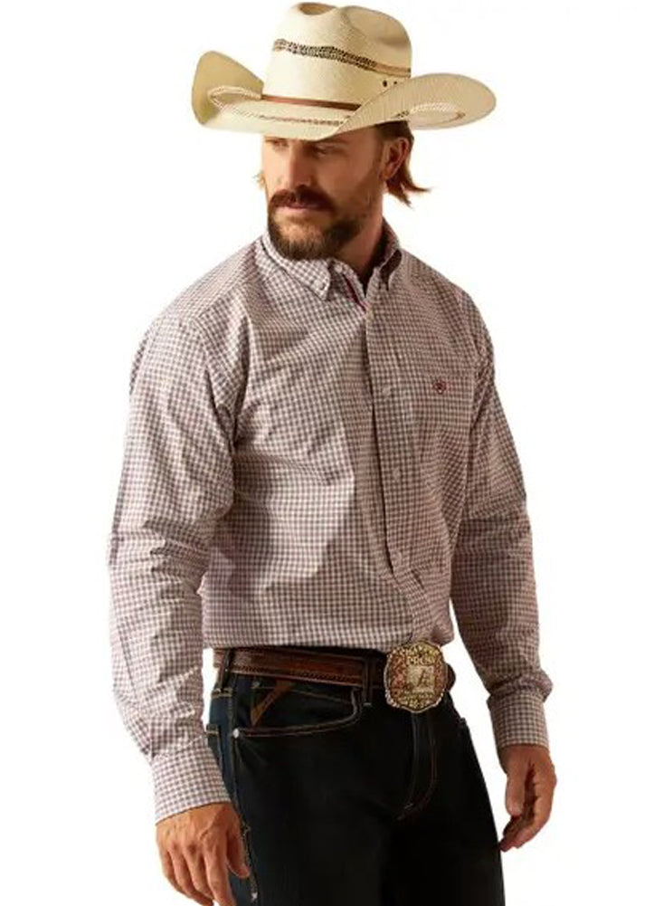 This brick micro-check button-down shirt blends tradition with polish. Featuring a classic fit, embroidered chest logo, and a crisp collar, it's designed for the cowboy who values both style and substance.