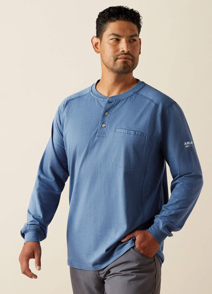 Stay comfortable and look effortlessly put-together with this rugged Ariat long-sleeve Henley. Crafted from soft, durable fabric, it features a classic three-button placket, reinforced stitching, and a convenient chest pocket for added functionality. The relaxed fit provides easy movement whether you're working outdoors, kicking back at home, or layering it under a jacket on cooler days. Finished in a versatile denim-blue shade with subtle Ariat branding on the sleeve, this Henley delivers everyday comfort with dependable, laid-back style.
