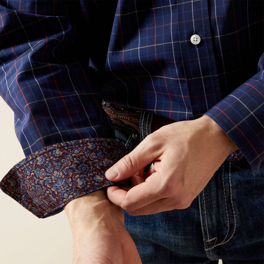 This long-sleeve button-down shirt showcases a timeless navy plaid pattern enhanced with fine red and white lines, offering a polished yet versatile look. With its structured collar, comfortable fit, and classic styling, it's an ideal choice for both everyday wear and more refined occasions.