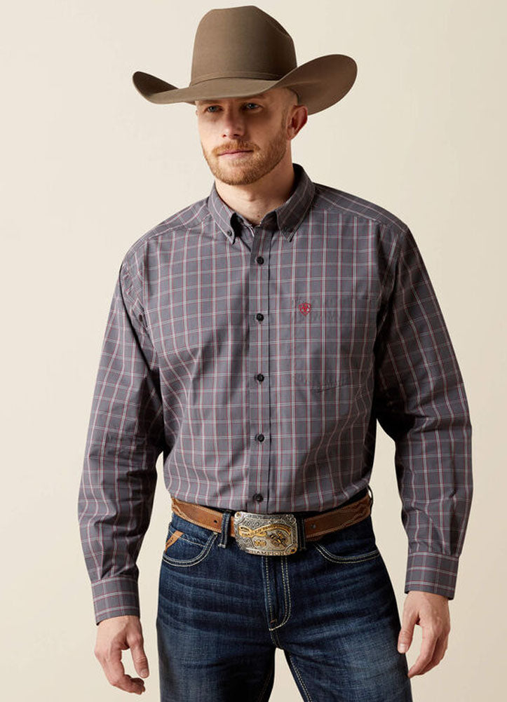 This long-sleeve button-down shirt showcases a timeless grey plaid pattern enhanced with fine red and white lines, offering a polished yet versatile look. With its structured collar, comfortable fit, and classic styling, it's an ideal choice for both everyday wear and more refined occasions.