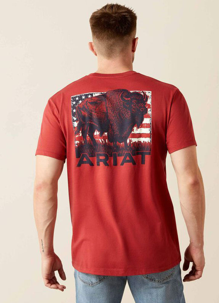 Show off rugged American spirit with this bold Ariat graphic tee, designed for comfort, durability, and standout style. Made from soft, breathable cotton, this classic crewneck delivers an easy, relaxed fit perfect for everyday wear. The front features a clean Ariat logo paired with a bison silhouette, while the back makes a statement with a striking full-size graphic—an American flag backdrop behind a powerful buffalo illustration. Whether you're headed to the ranch, the weekend barbecue, or just keeping it casual, this tee offers the perfect blend of comfort, heritage, and unmistakable Ariat attitude.