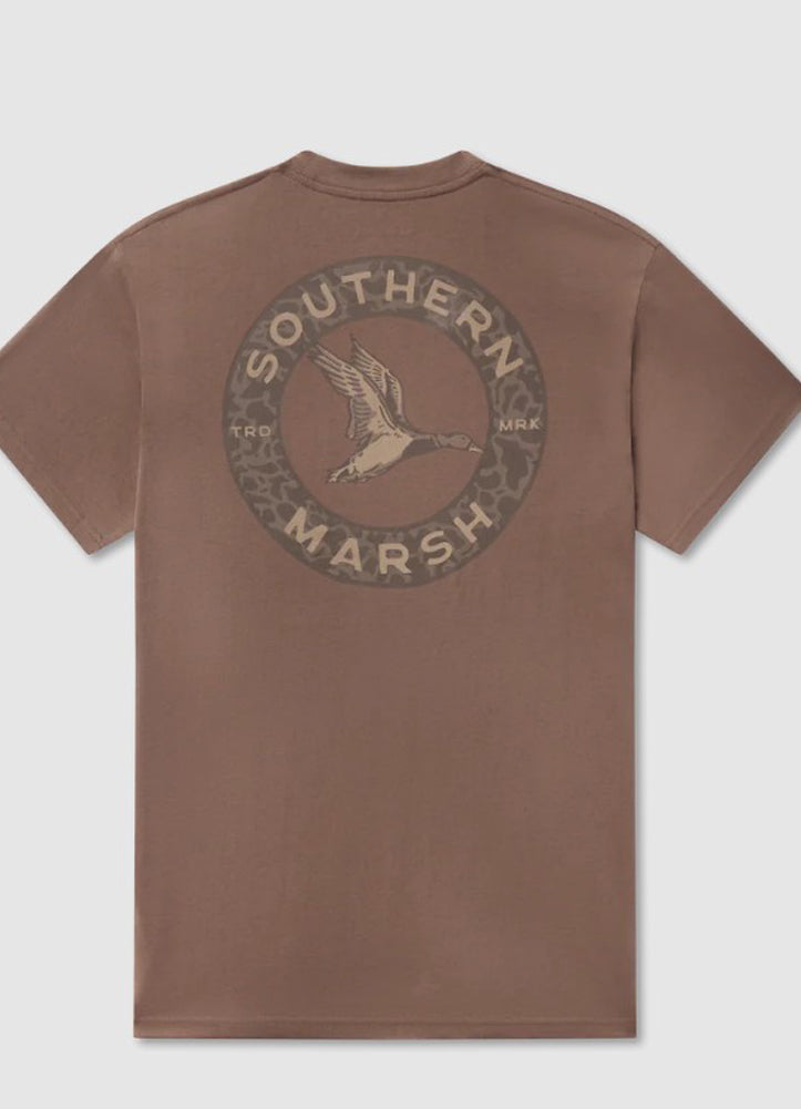 Made from premium cotton fabric, this Southern Marsh tee features a vintage flying duck logo with a camo-accented circle. Perfect for those who embrace the outdoors and appreciate classic Southern style.